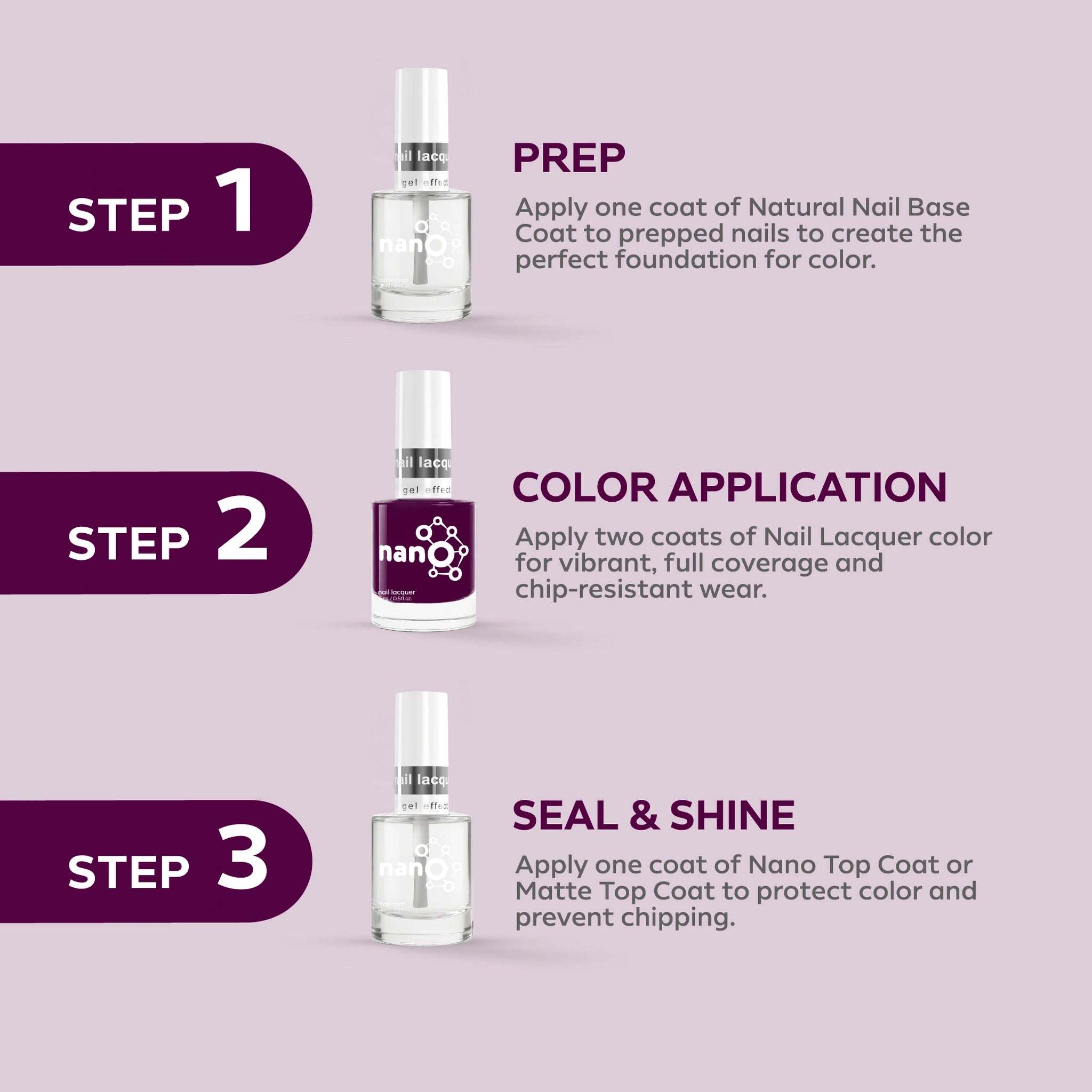- ضعي طبقة من Nano® Normal Base Coat لحماية أظافرك الطبيعية وضمان التصاق أفضل.