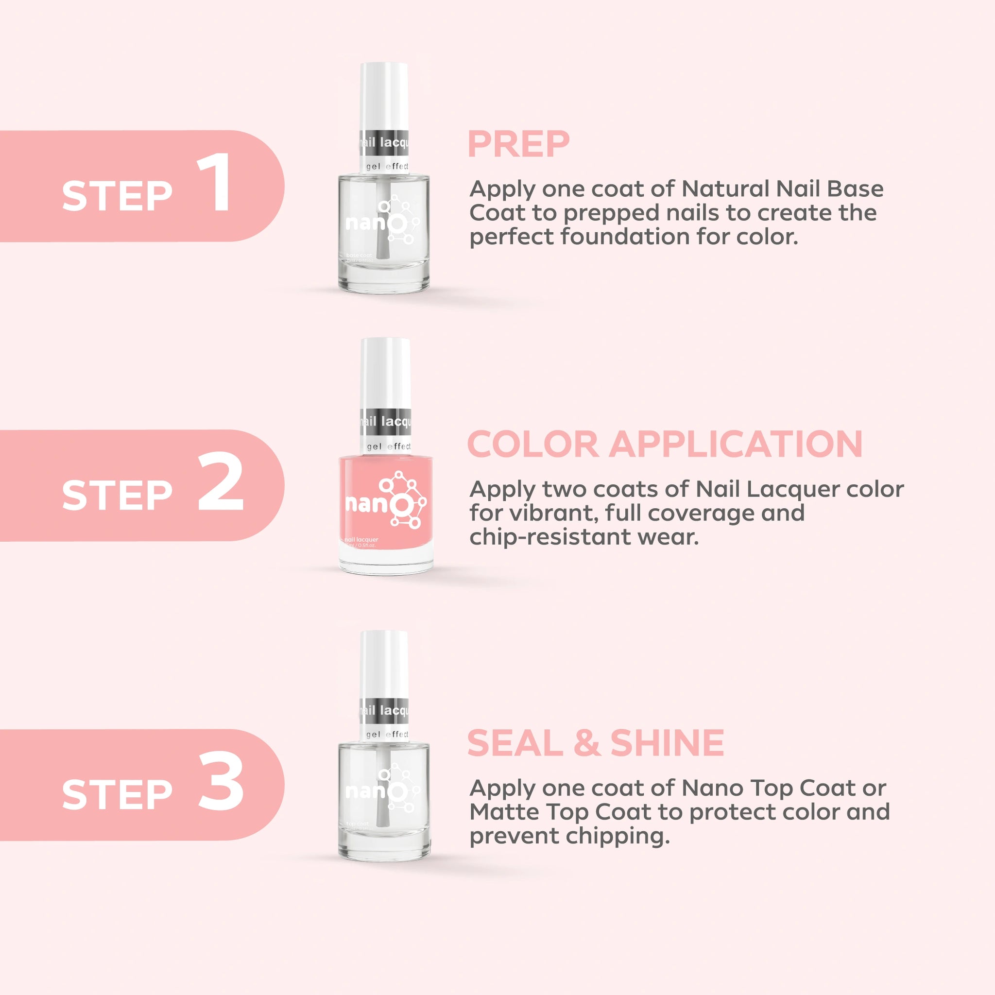 - ضعي طبقة من Nano® Normal Base Coat لحماية أظافرك الطبيعية وضمان التصاق أفضل.