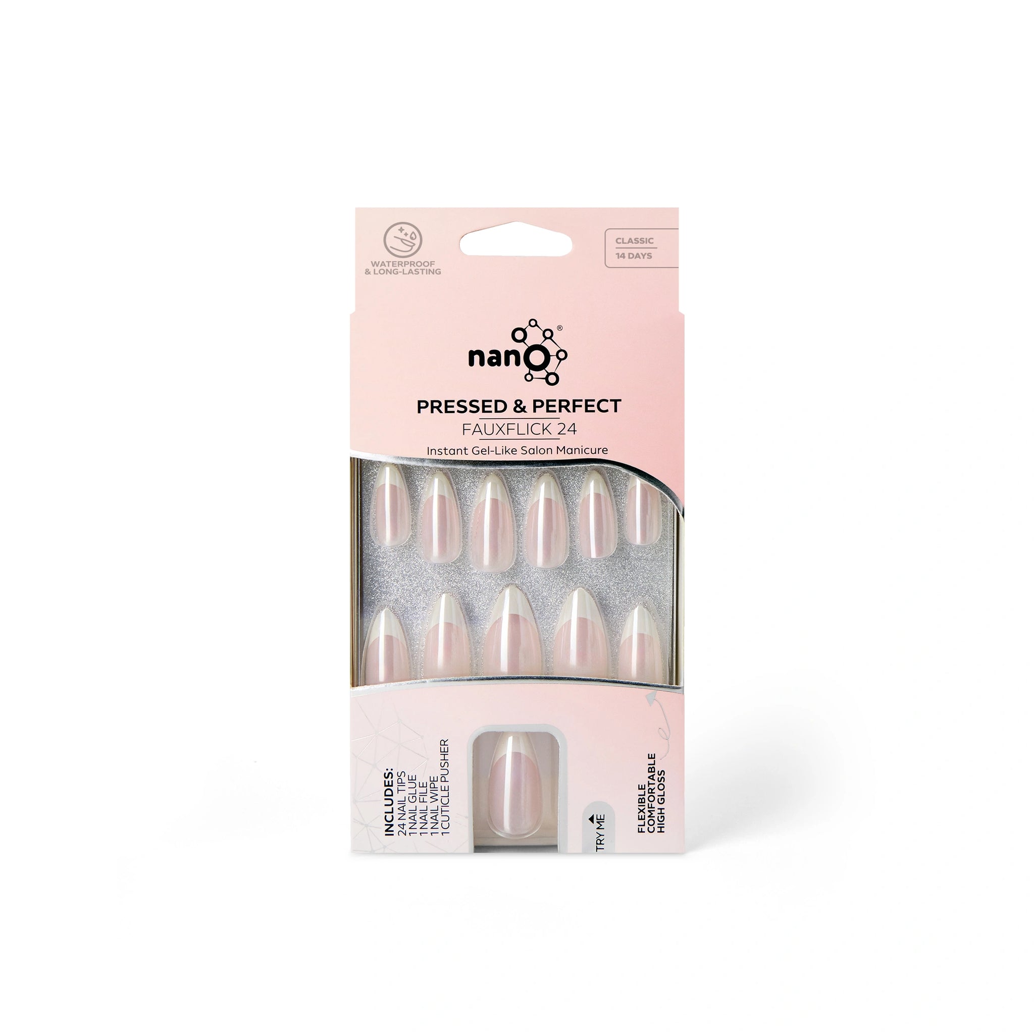 Nano® Barely French Pressed on Nails - 24pcs with Glue | Instant Gel-Like Shine, Chrome French Glossy Fake Nails Set