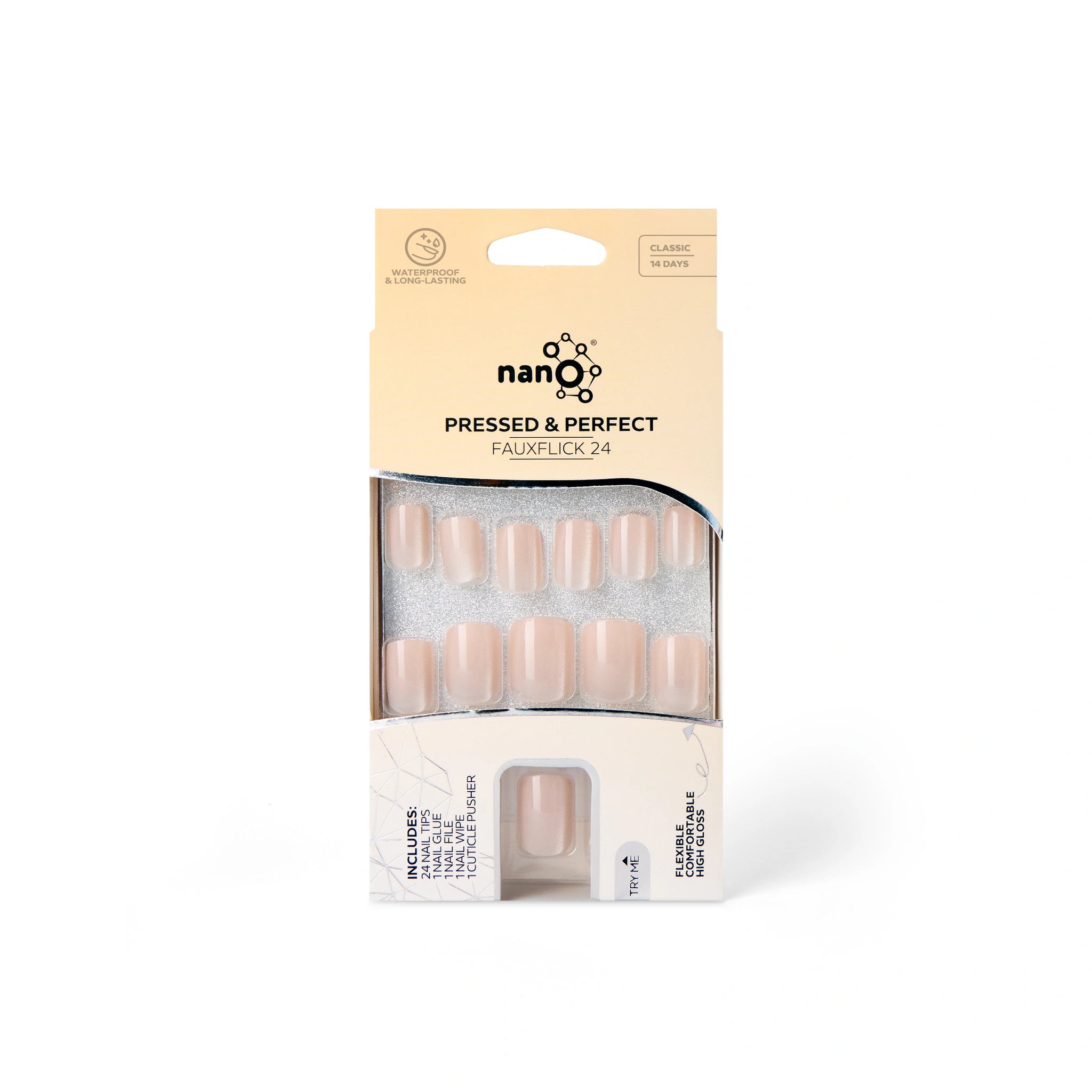 Nano® Celestial Blush Pressed on Nails - 24pcs with Glue | Instant Gel-Like Shine, Nude Beige Glossy Fake Nails Set