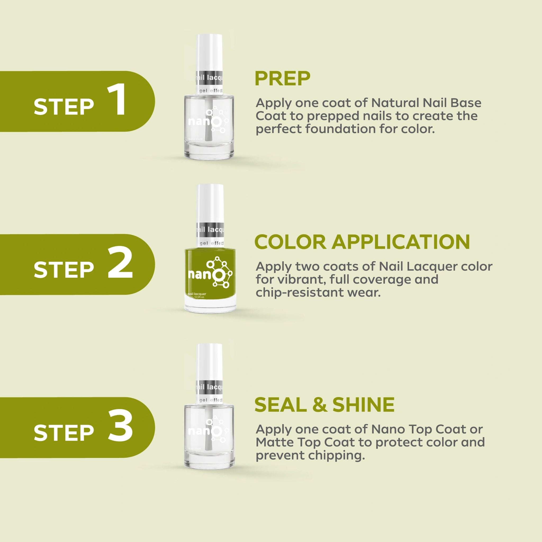 - قم بإنهاء العمل عن طريق تطبيق Nano® Normal Top Coat للحصول على لمسة نهائية لامعة تدوم طويلاً.