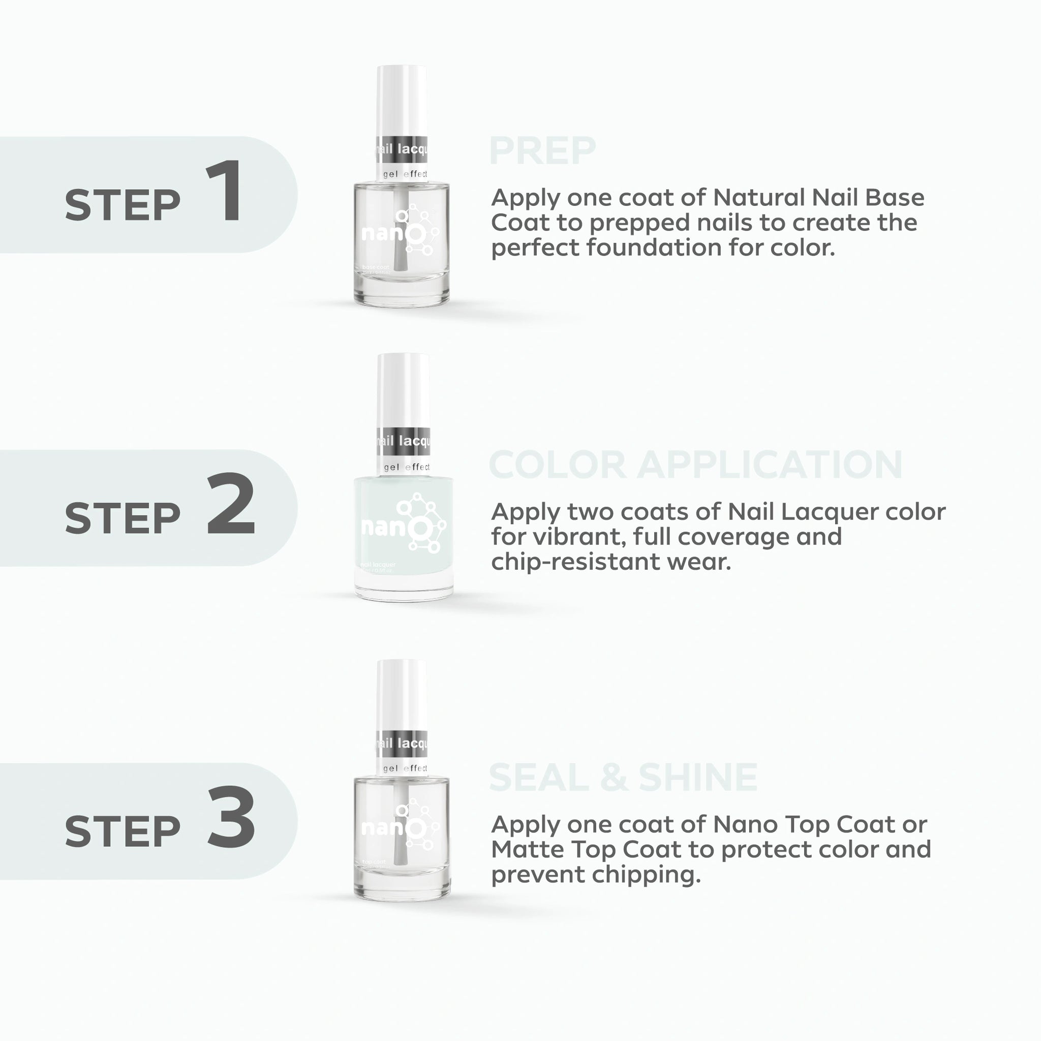- ضعي طبقة من Nano® Normal Base Coat لحماية أظافرك الطبيعية وضمان التصاق أفضل.