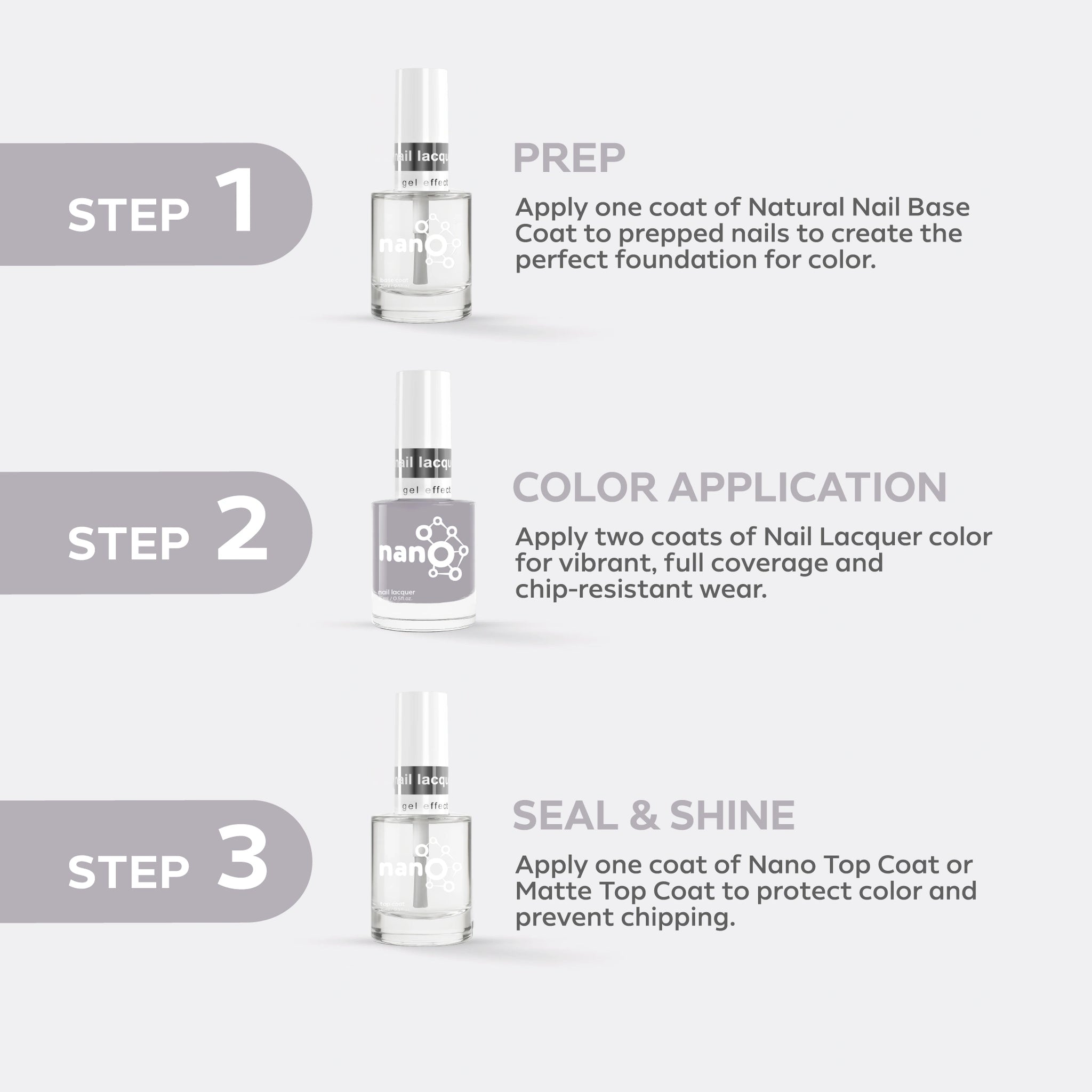 - ضعي طبقة من Nano® Normal Base Coat لحماية أظافرك الطبيعية وضمان التصاق أفضل.