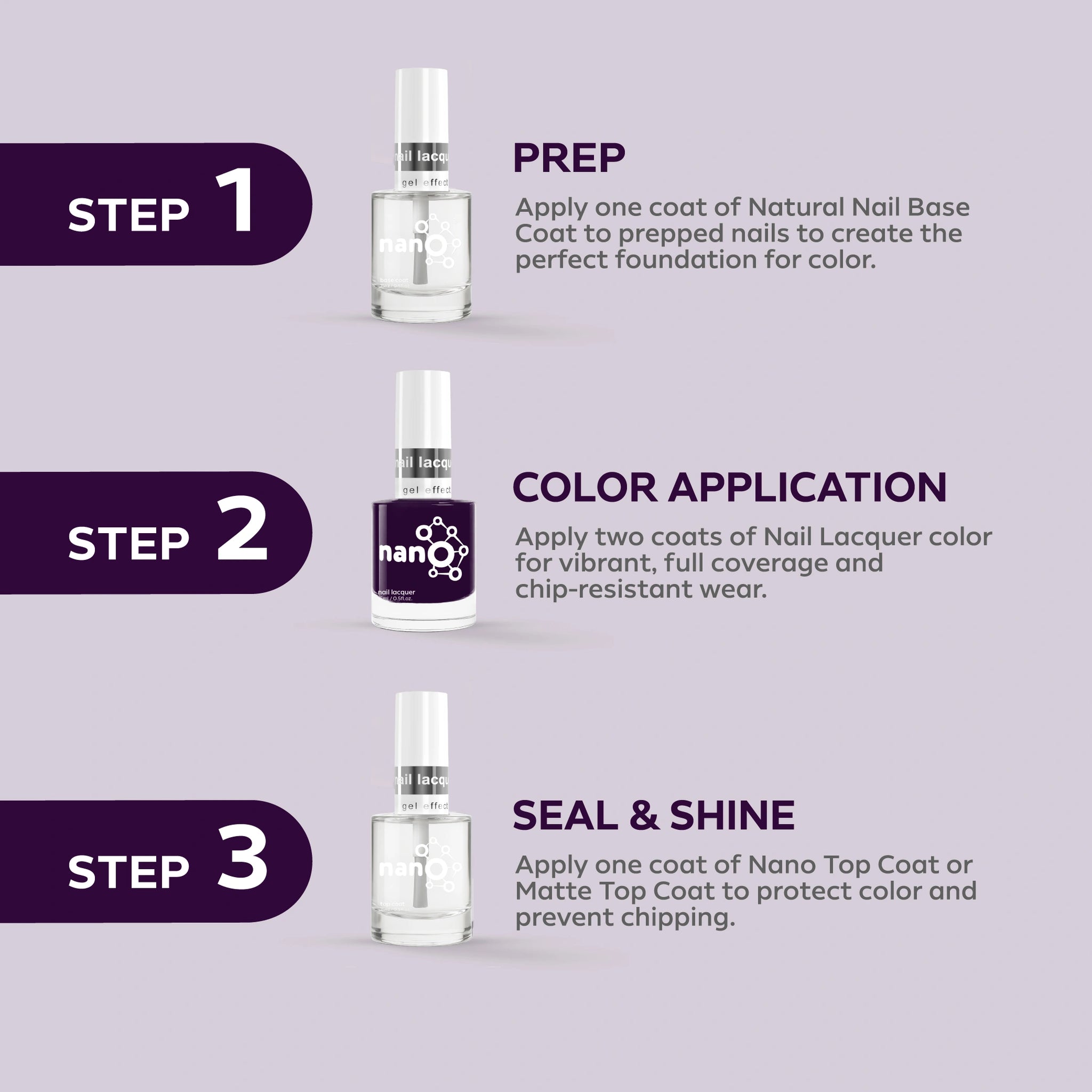 - ضعي طبقة من Nano® Normal Base Coat لحماية أظافرك الطبيعية وضمان التصاق أفضل.