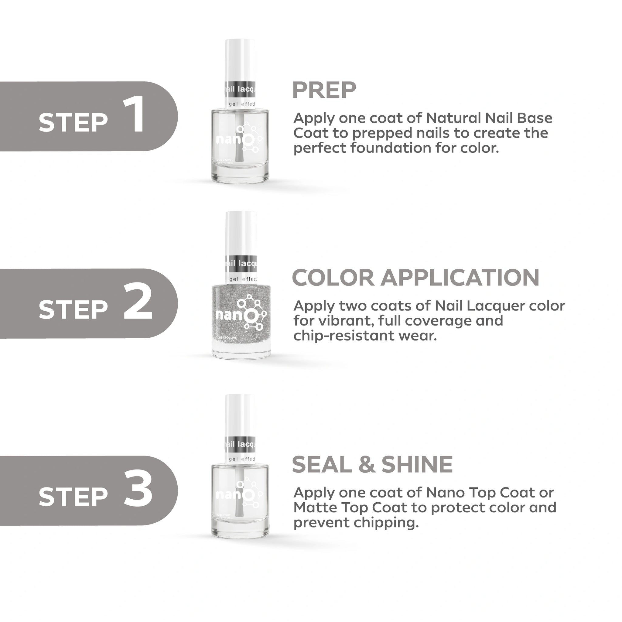 - ضعي طبقة من Nano® Normal Base Coat لحماية أظافرك الطبيعية وضمان التصاق أفضل.