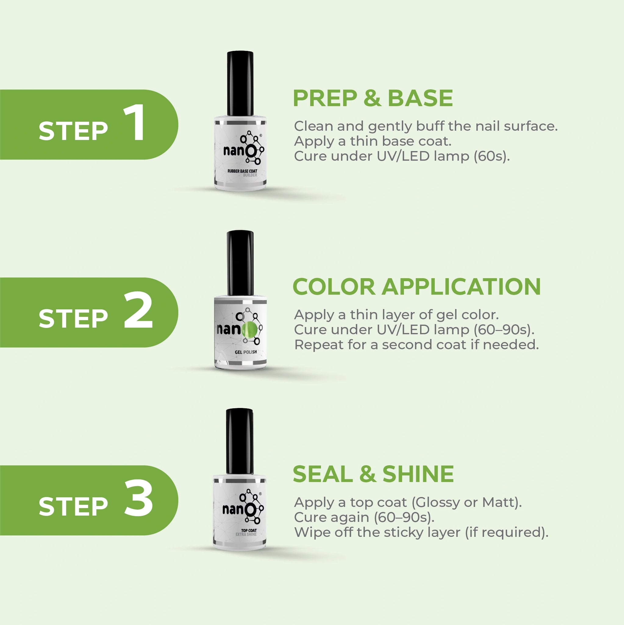 - ضعي طبقة ثانية من طلاء الأظافر الجل Nano® وجففيها تحت مصباح Nano UV/LED لمدة 60 ثانية إضافية.