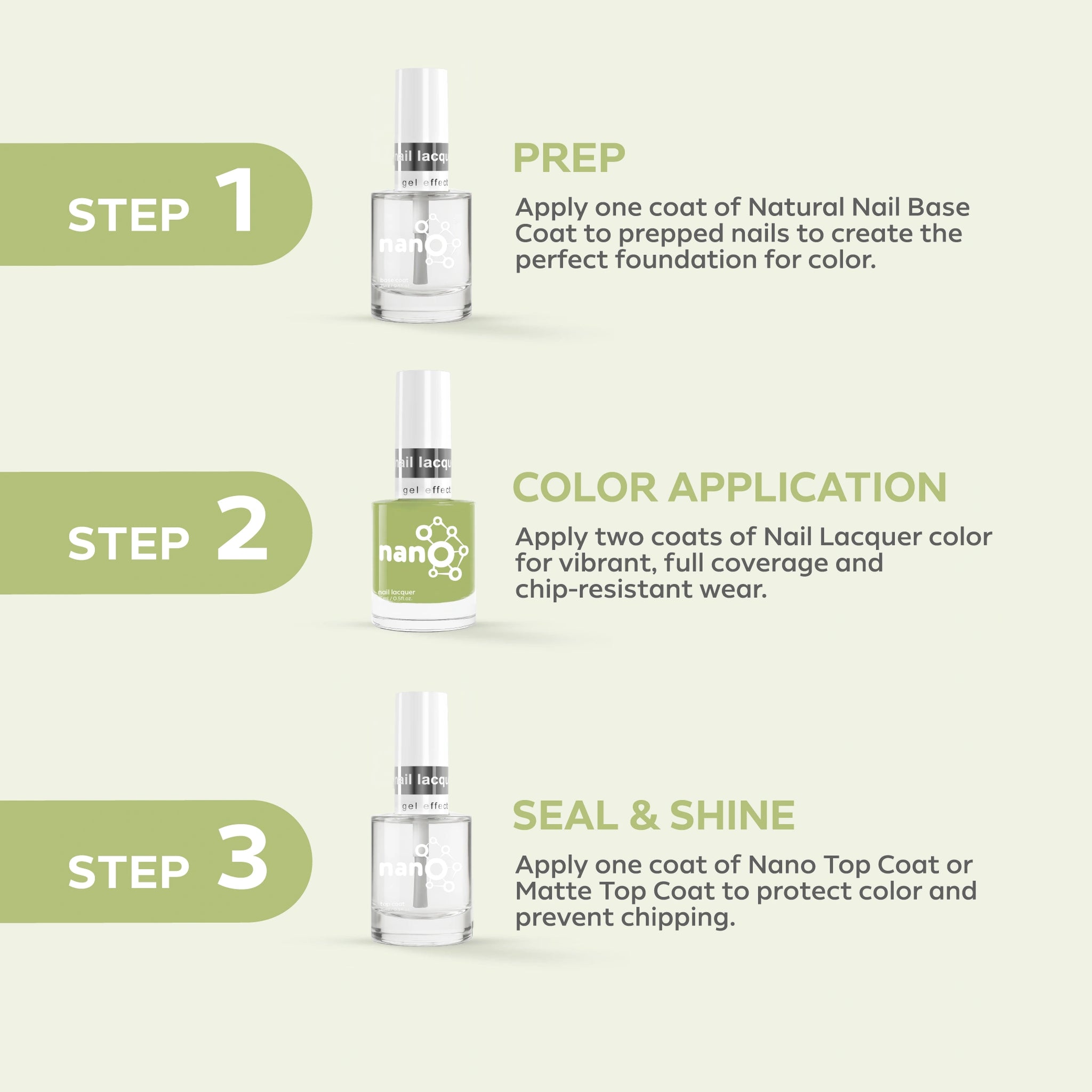 - ضعي طبقة من Nano® Normal Base Coat لحماية أظافرك الطبيعية وضمان التصاق أفضل.