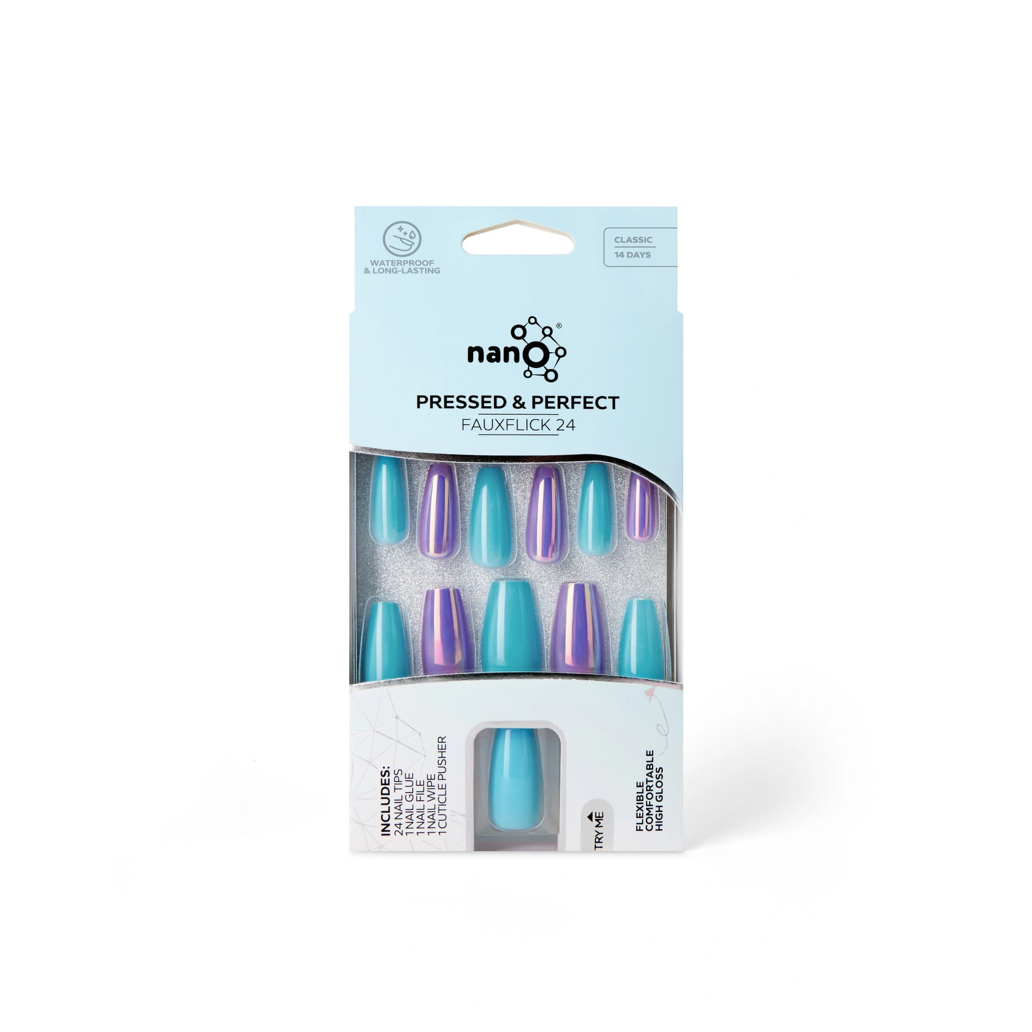 Nano® Mirror Chrome & Aqua Blue Pressed on Nails - 24pcs with Glue | Instant Gel-Like Shine, Dual-Tone Chrome Blue Fake Nails Set