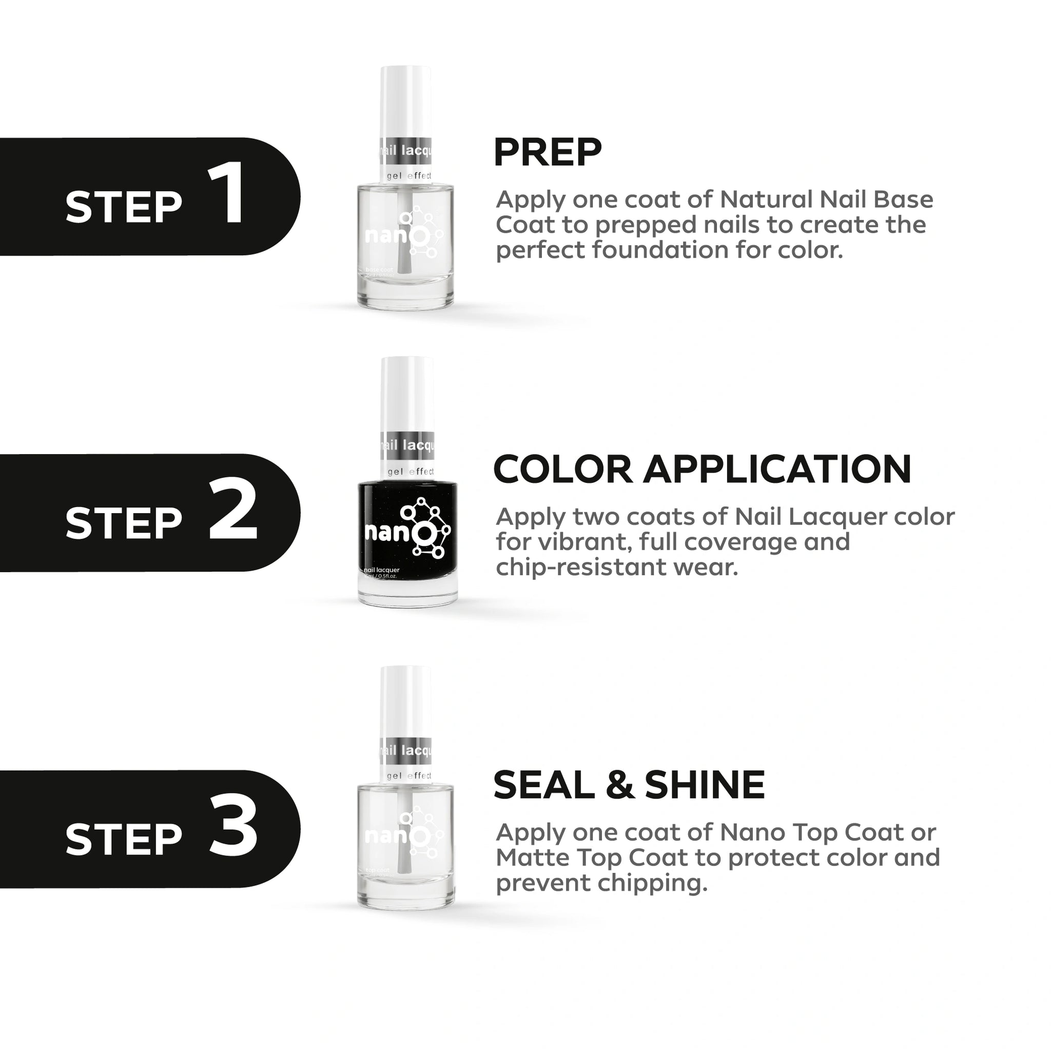 - ضعي طبقة من Nano® Normal Base Coat لحماية أظافرك الطبيعية وضمان التصاق أفضل.