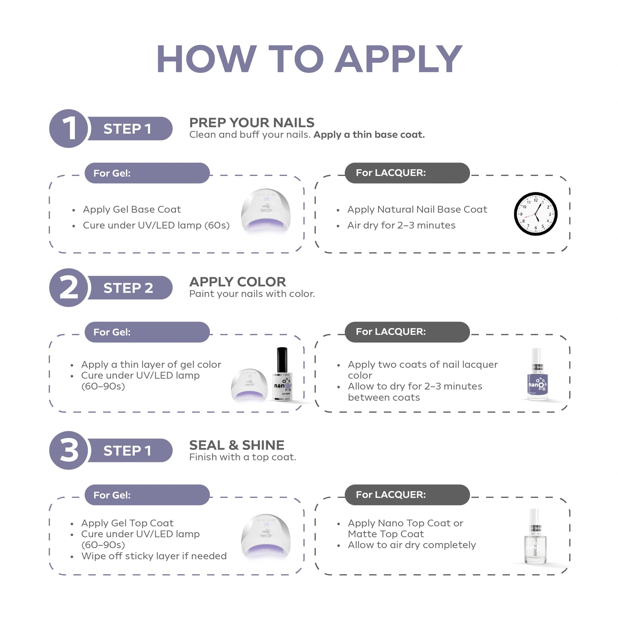 - Apply Normal Base Coat to protect natural nails and improve adhesion.