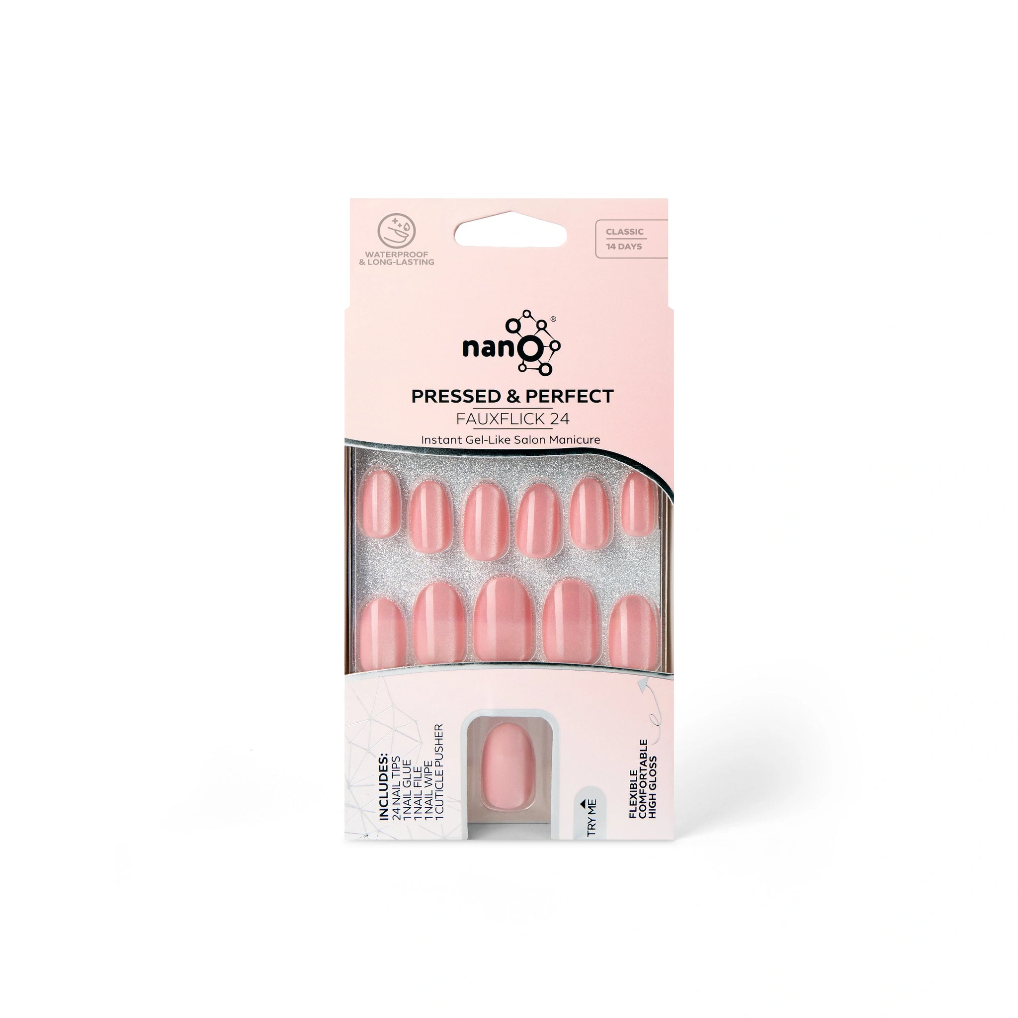 - 24 pre-shaped press-on nails with natural curve