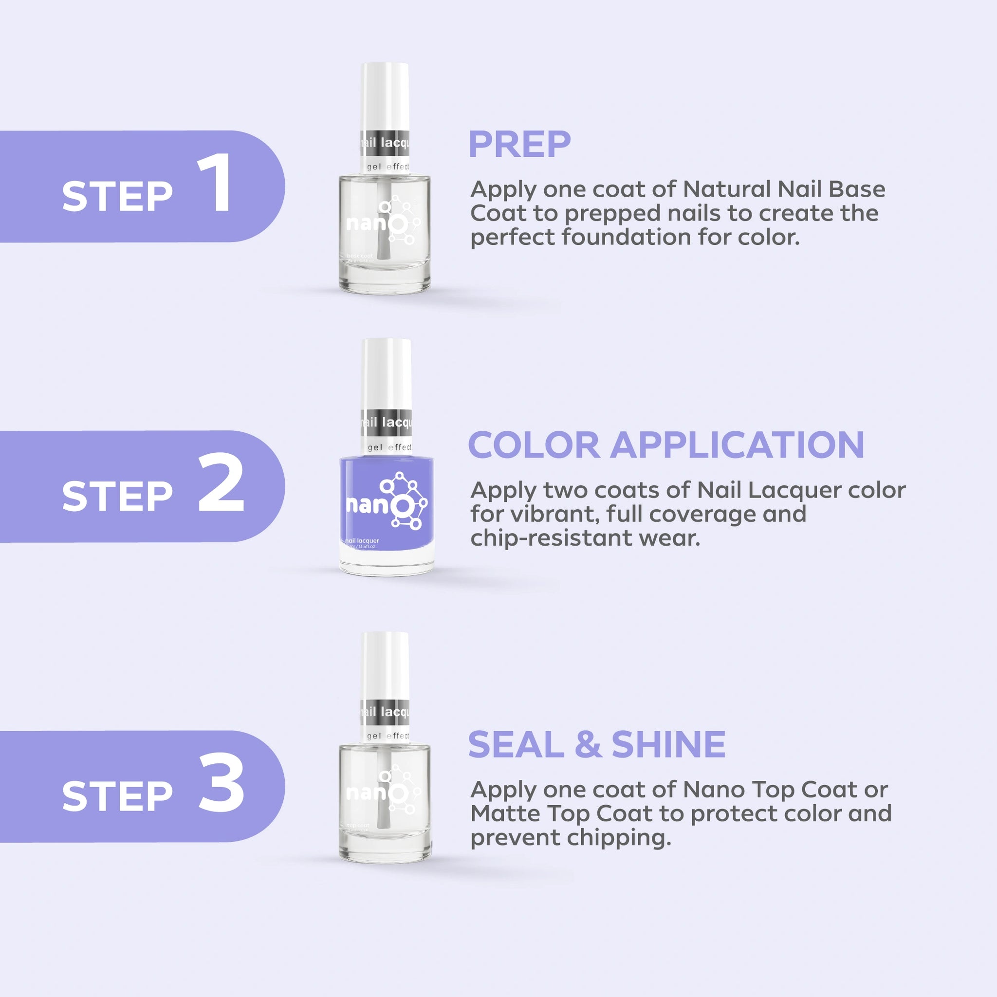 - ضعي طبقة من Nano® Normal Base Coat لحماية أظافرك الطبيعية وضمان التصاق أفضل.