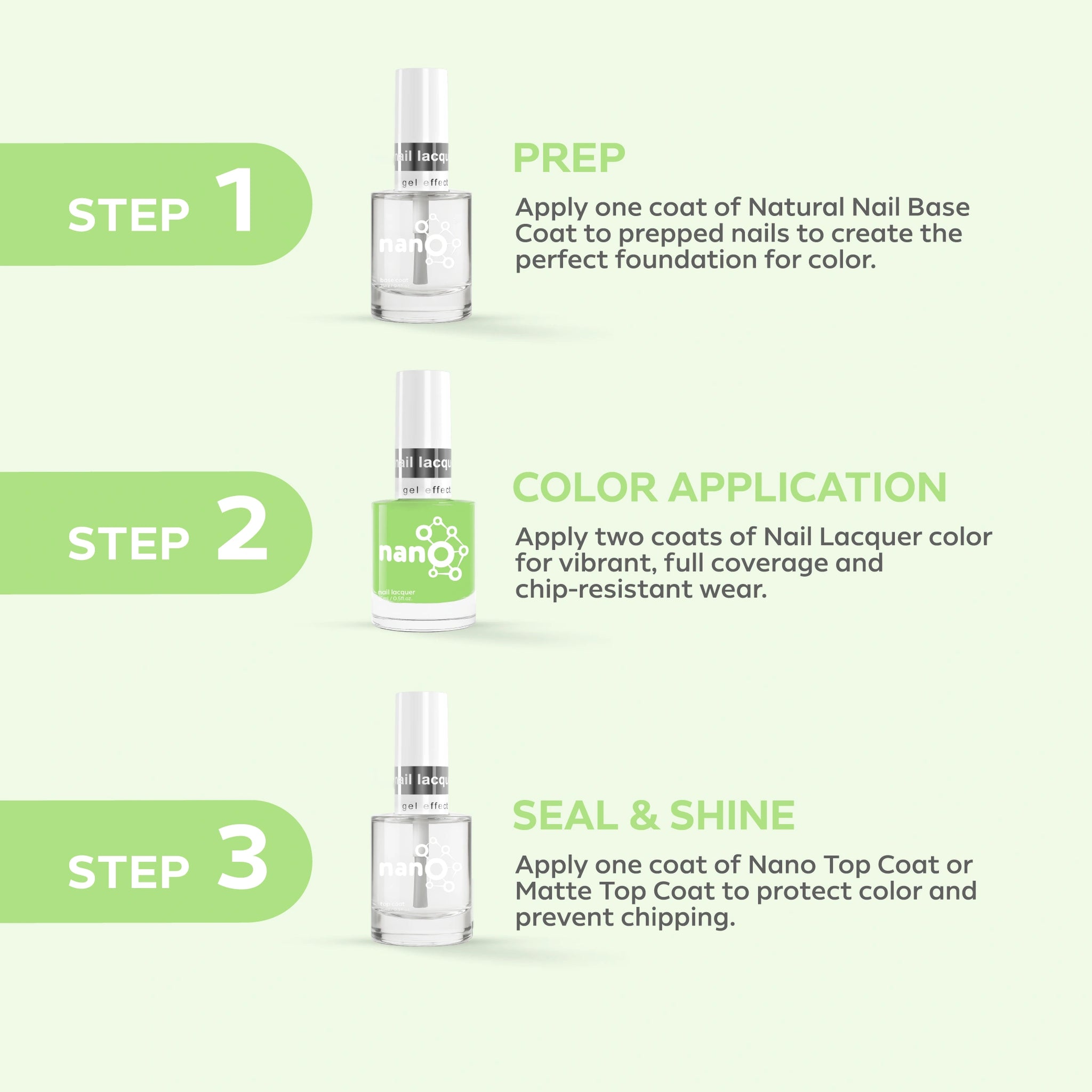 - ضعي طبقة من Nano® Normal Base Coat لحماية أظافرك الطبيعية وضمان التصاق أفضل.