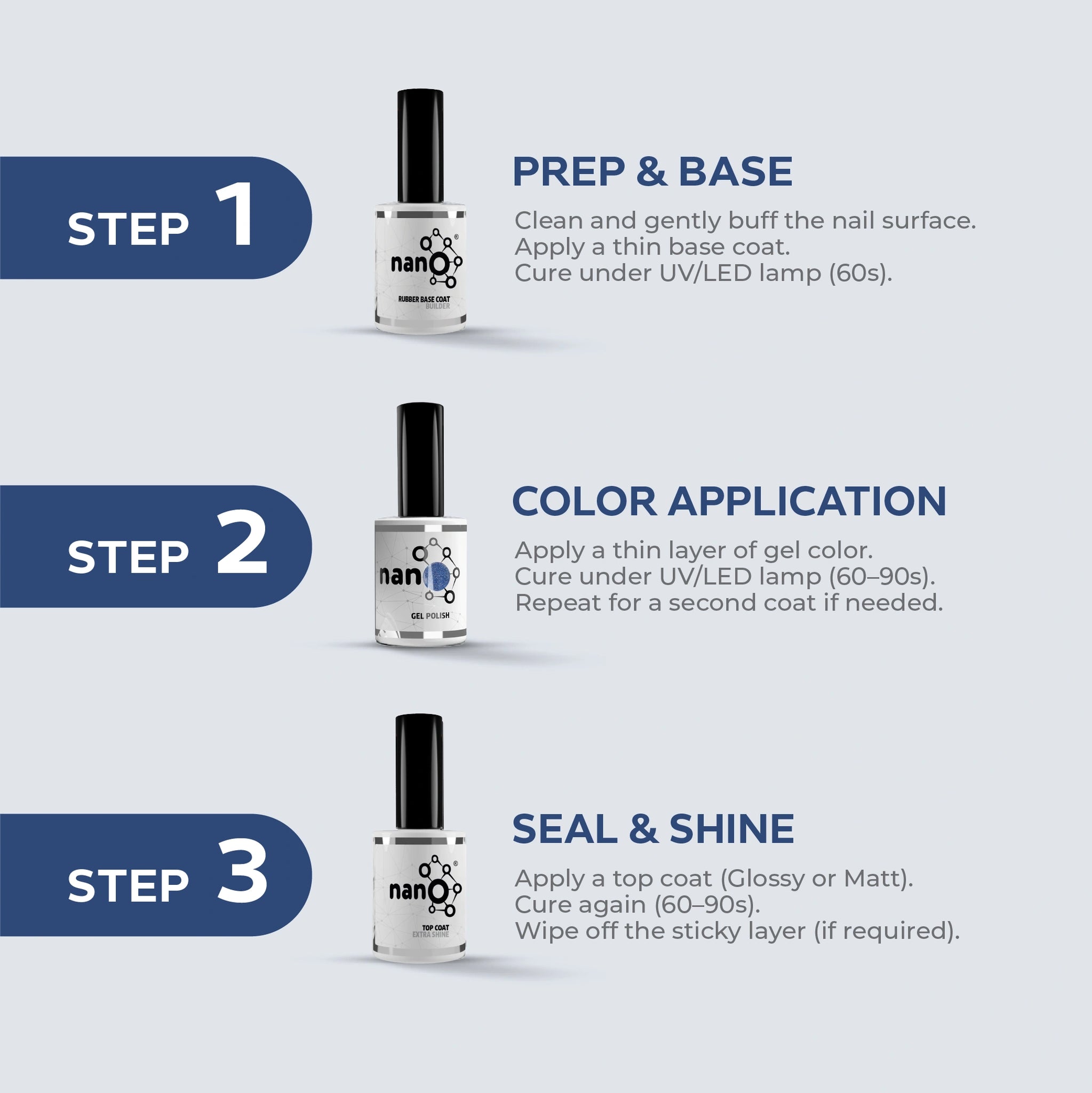 - ضعي طبقة ثانية من طلاء الأظافر الجل Nano® وجففيها تحت مصباح Nano UV/LED لمدة 60 ثانية إضافية.