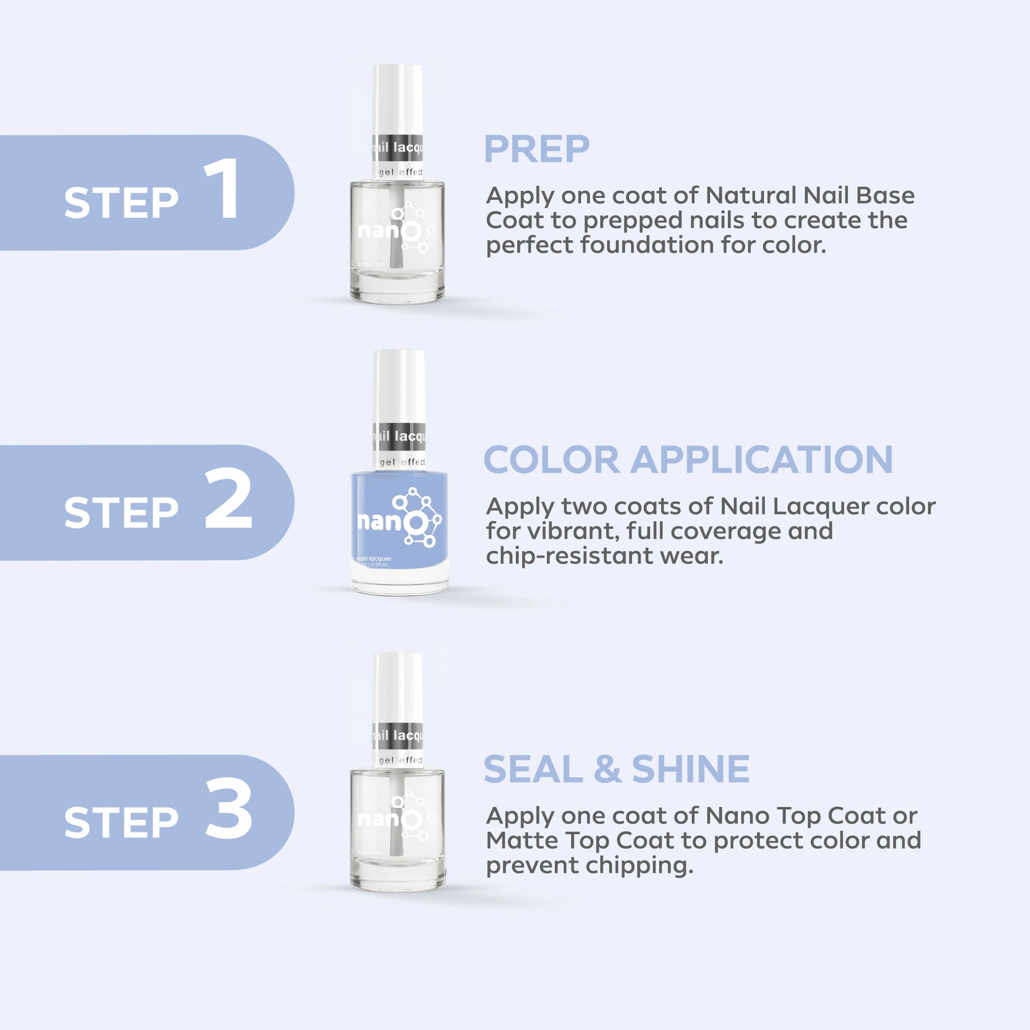 - قم بإنهاء العمل عن طريق تطبيق Nano® Normal Top Coat للحصول على لمسة نهائية لامعة تدوم طويلاً.