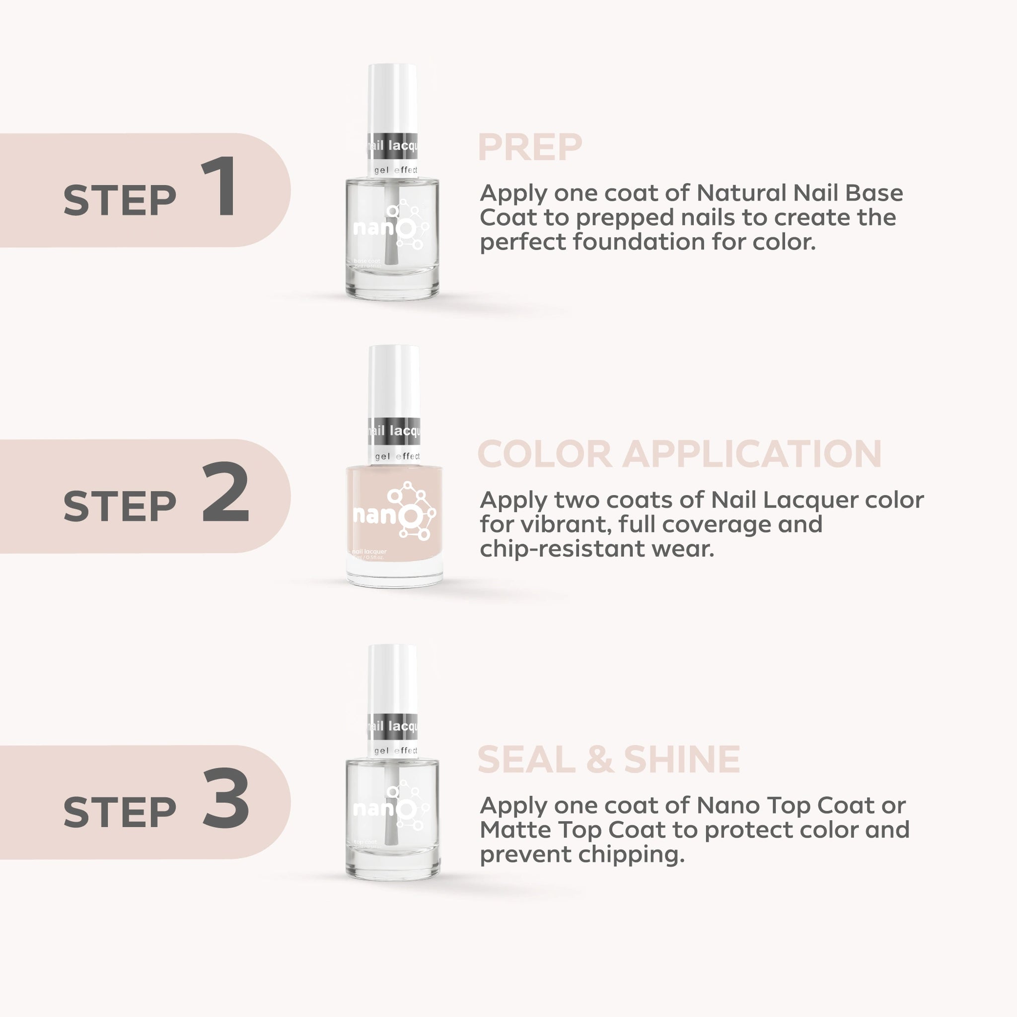 - ضعي طبقة من Nano® Normal Base Coat لحماية أظافرك الطبيعية وضمان التصاق أفضل.