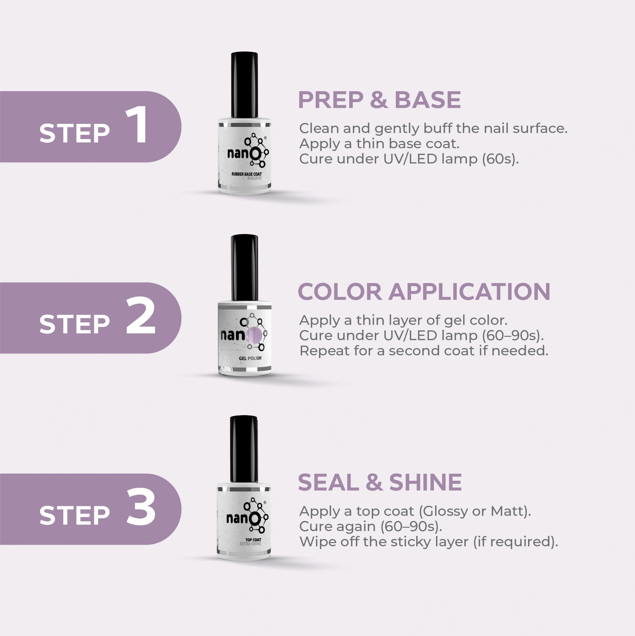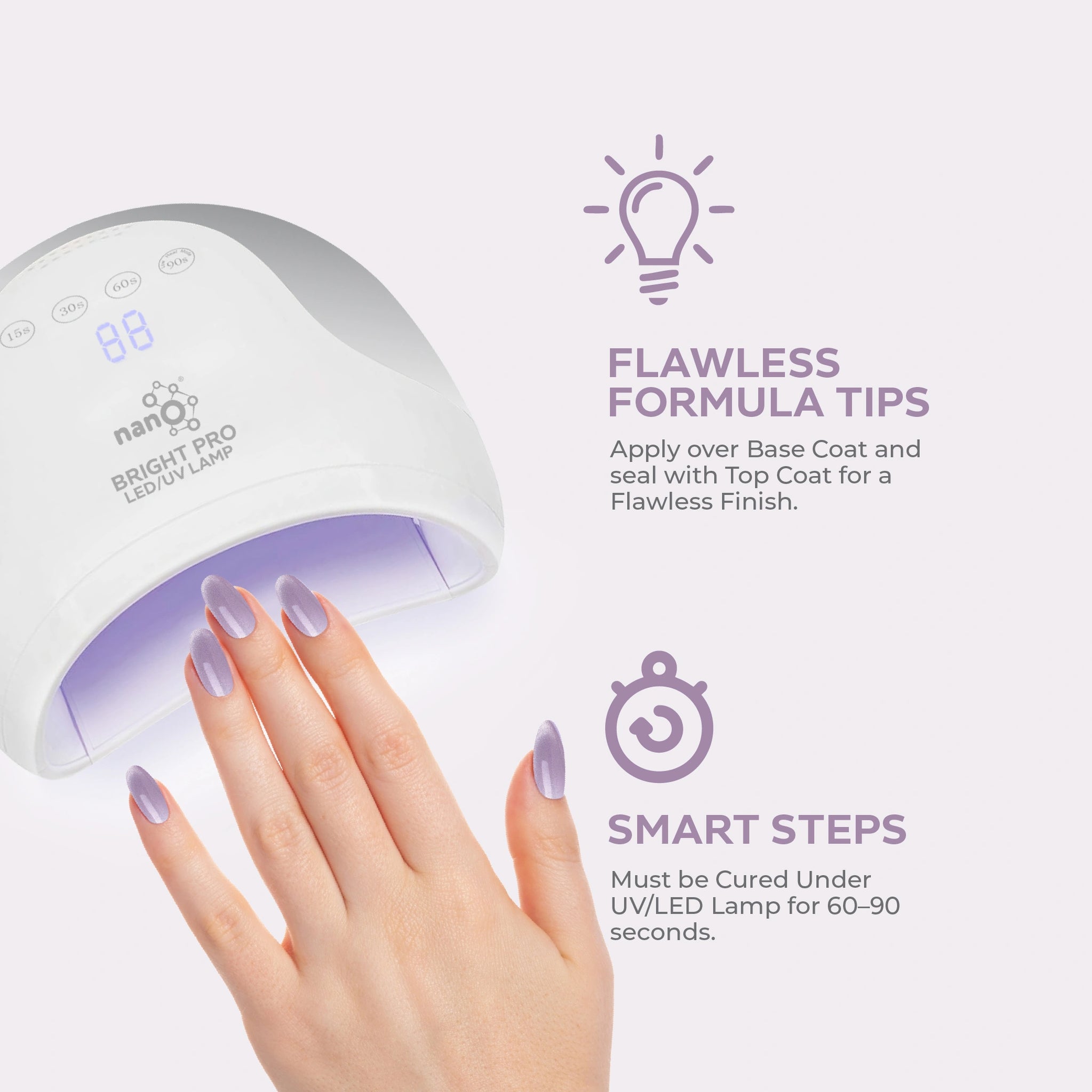 - ضعي طبقة القاعدة Nano® / Light Builder المفضلة لديك على الأظافر النظيفة وجففيها تحت مصباح Nano® Bright UV/LED لمدة 60 ثانية.