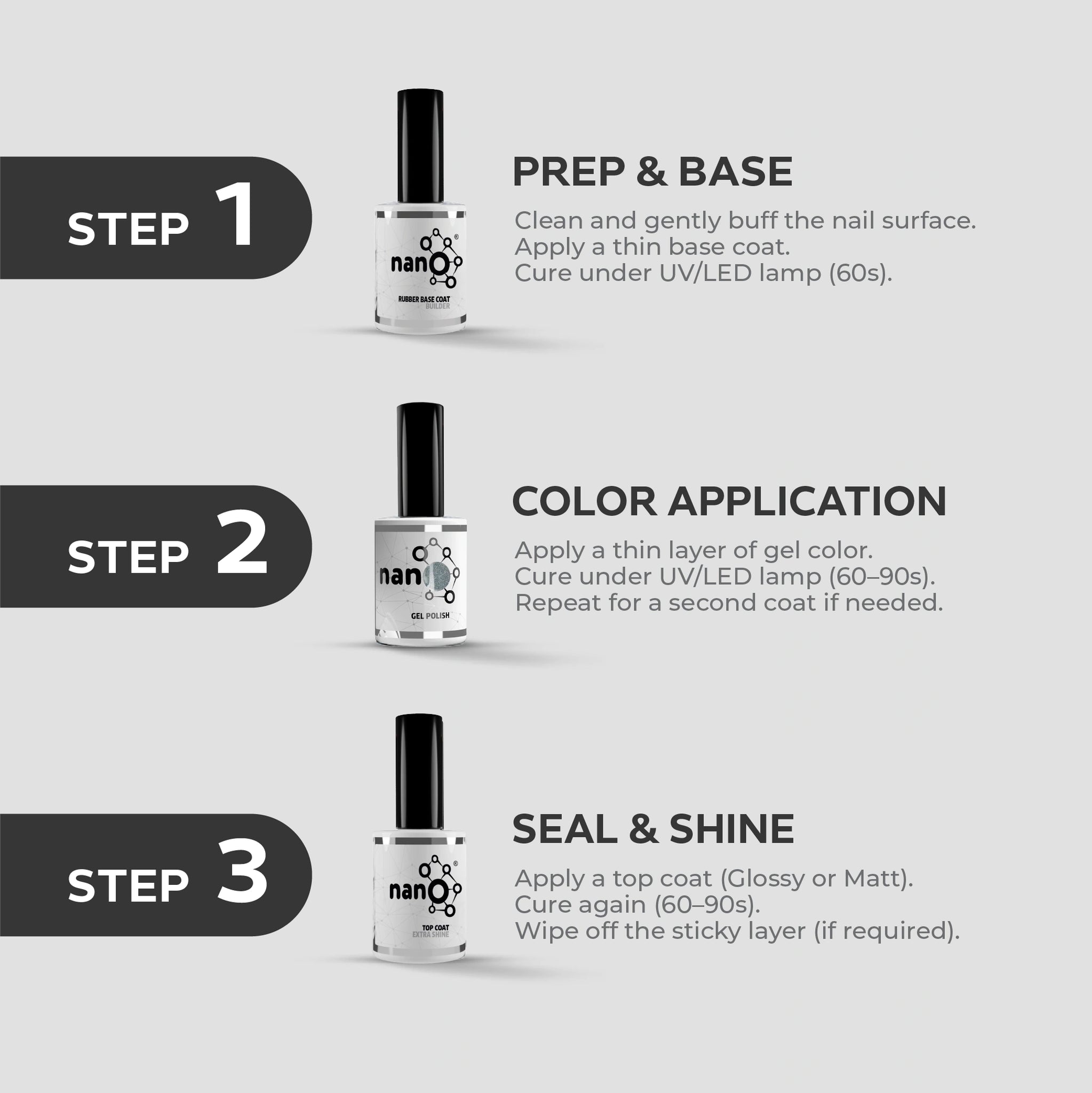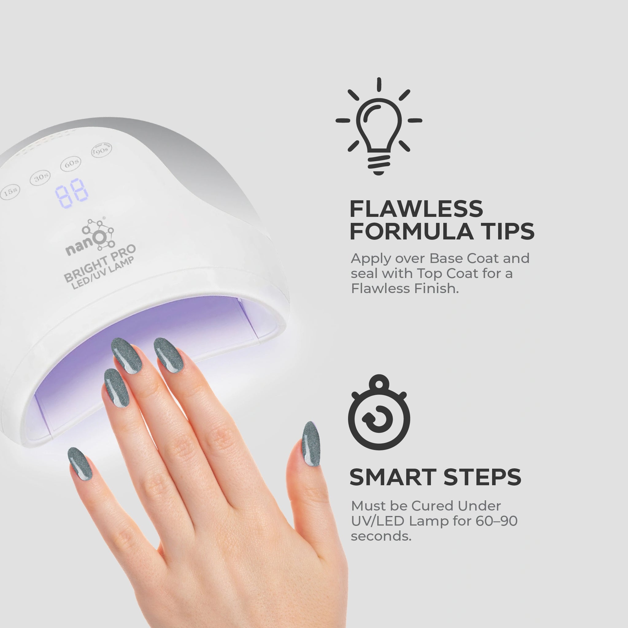 - ضعي طبقة القاعدة Nano® / Light Builder المفضلة لديك على الأظافر النظيفة وجففيها تحت مصباح Nano® Bright UV/LED لمدة 60 ثانية.