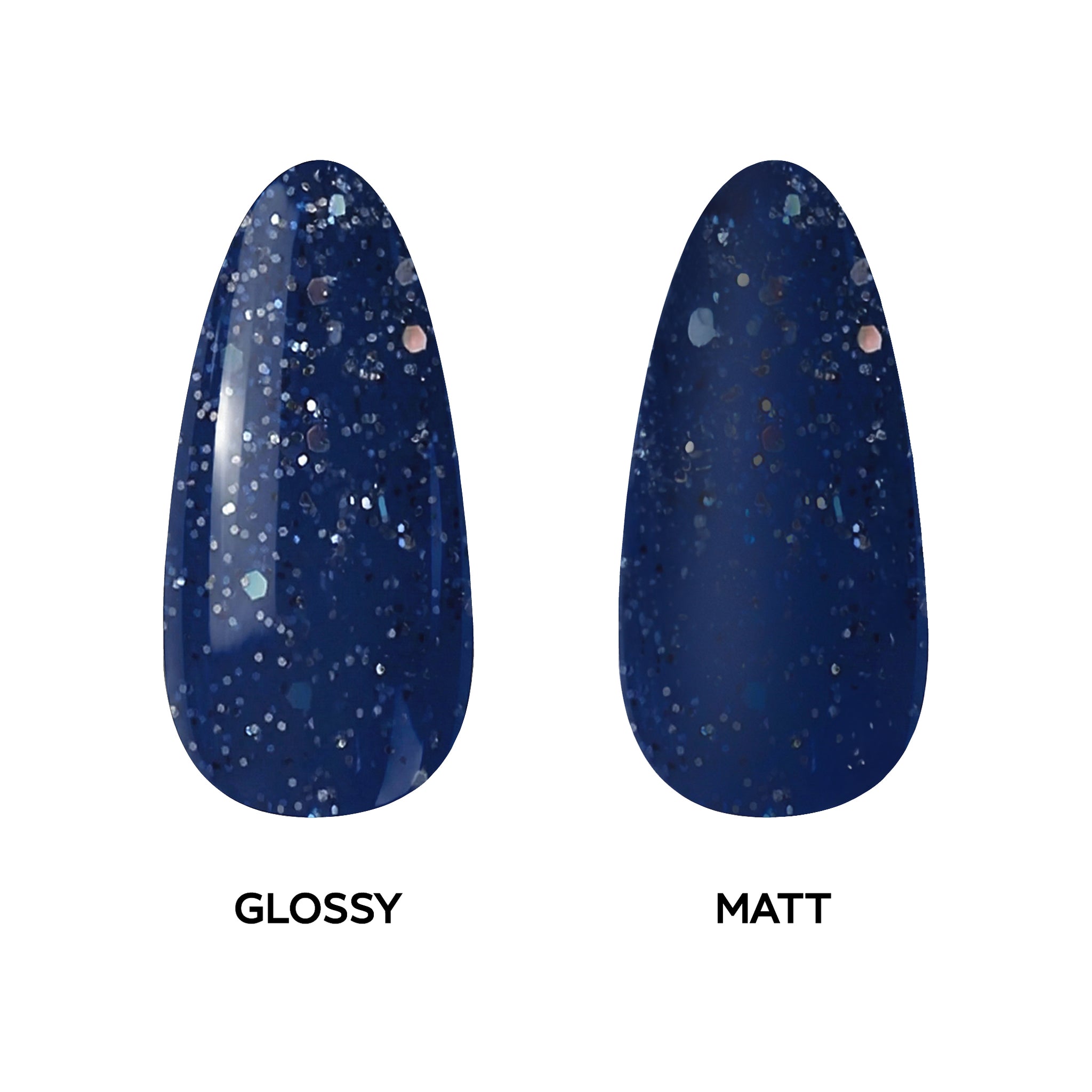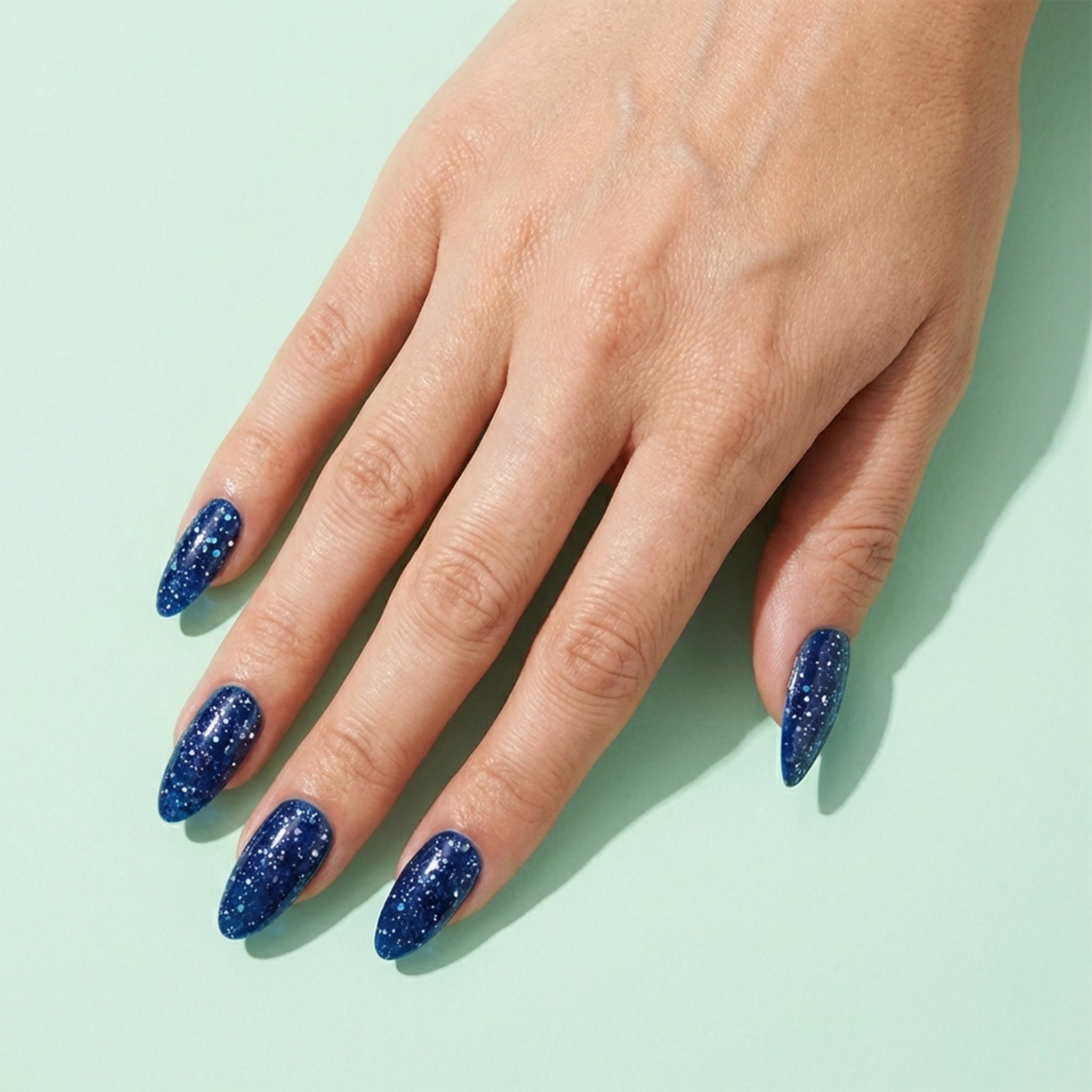Sparkling Navy، لون أزرق عميق وغامض مزين بالبريق يضفي عنصرًا من سماء الليل المرصعة بالنجوم على أظافرك