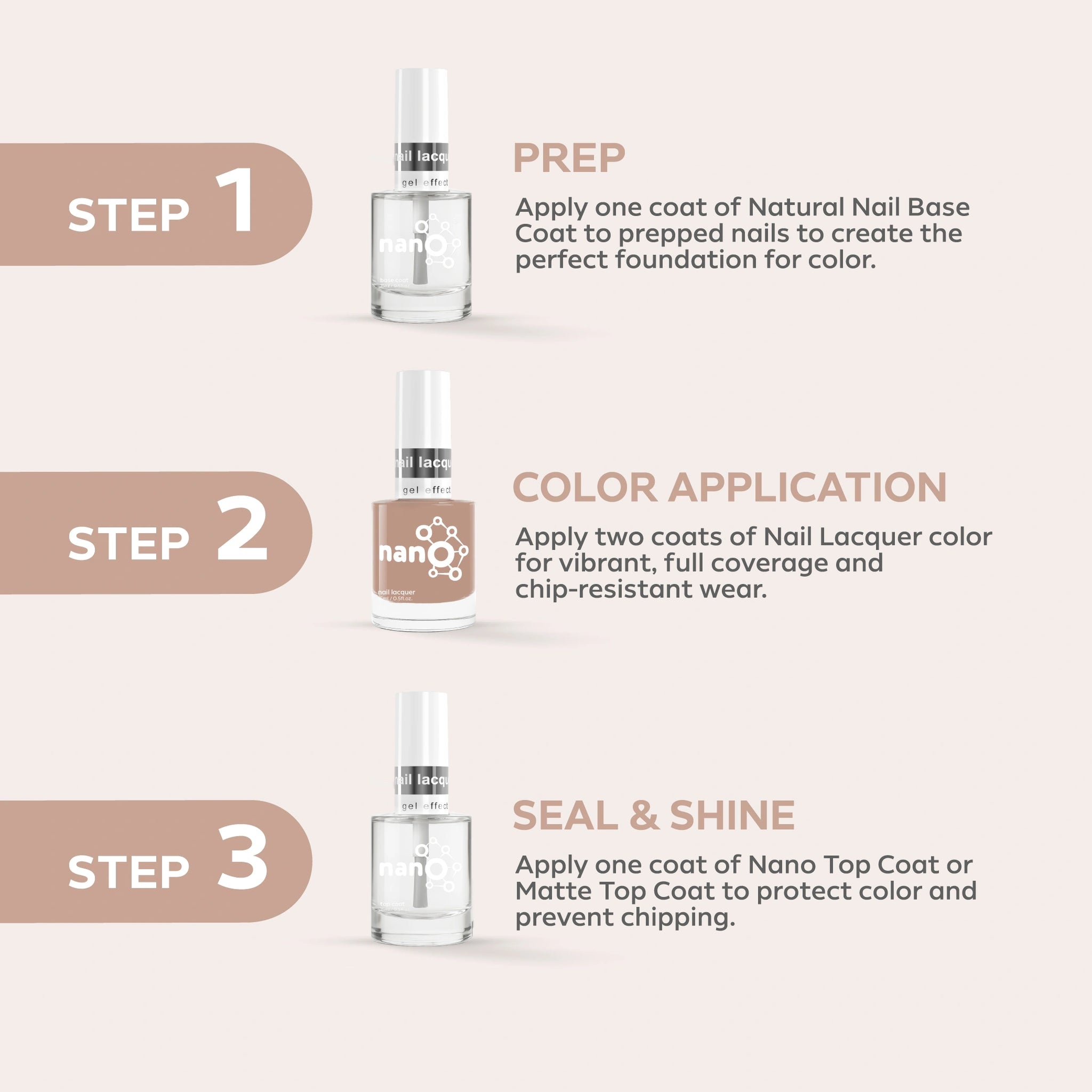 - ضعي طبقة من Nano® Normal Base Coat لحماية أظافرك الطبيعية وضمان التصاق أفضل.