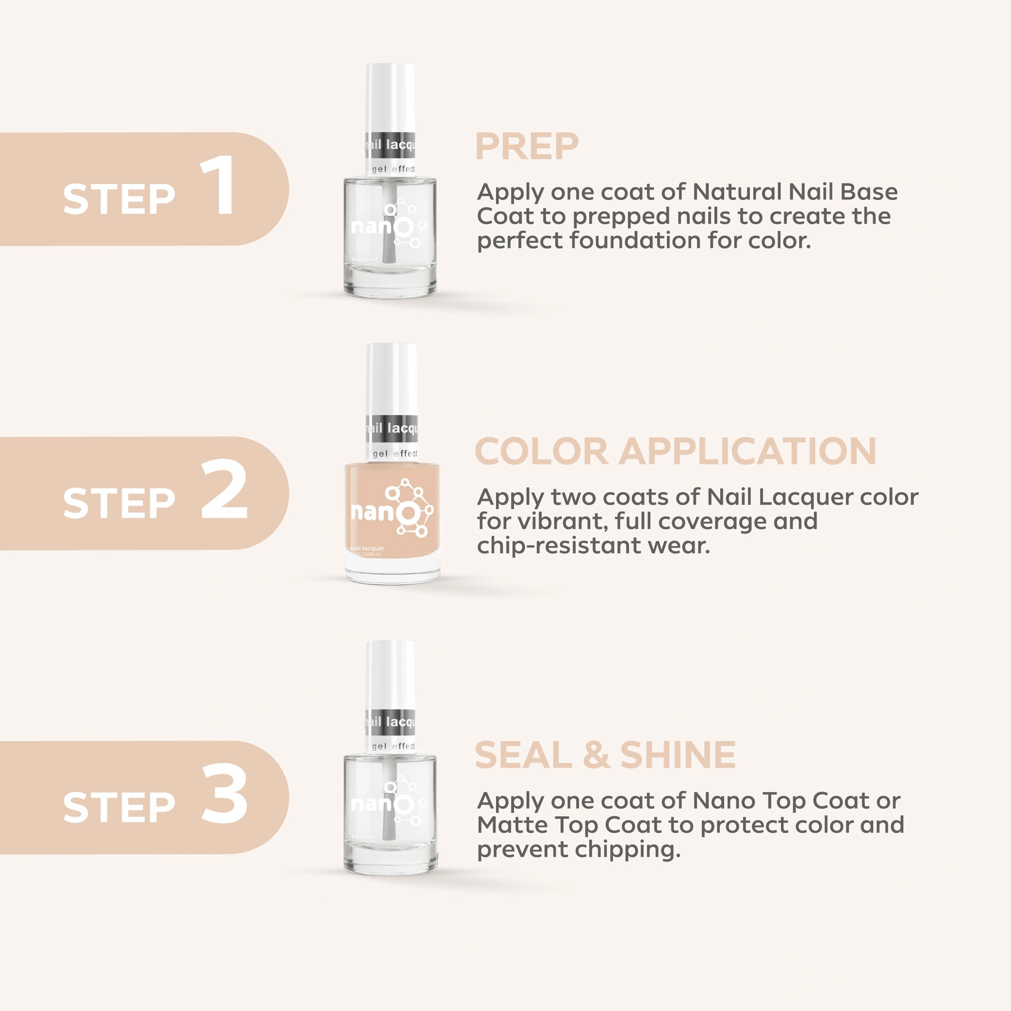 - ضعي طبقة من Nano® Normal Base Coat لحماية أظافرك الطبيعية وضمان التصاق أفضل.