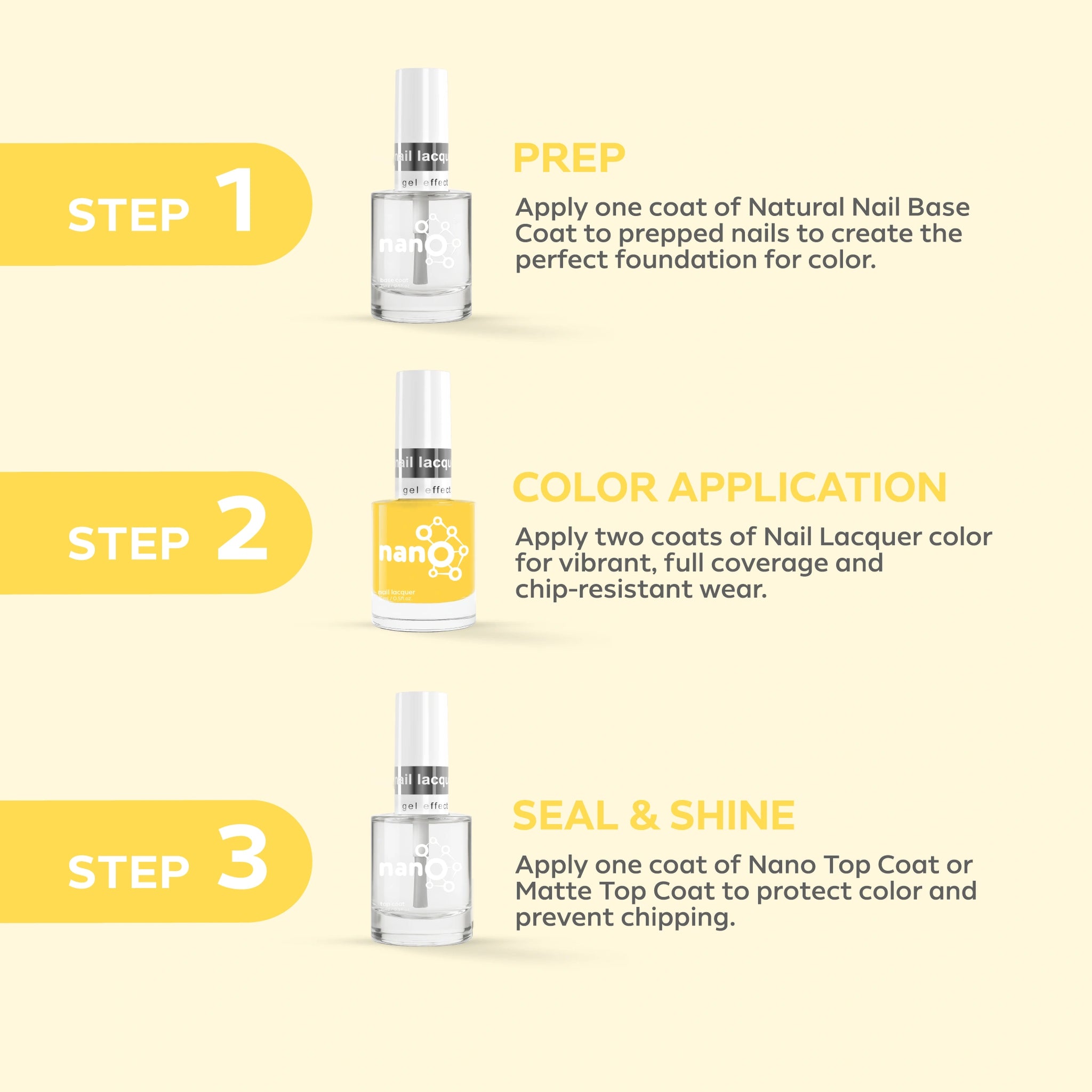 - قم بإنهاء العمل عن طريق تطبيق Nano® Normal Top Coat للحصول على لمسة نهائية لامعة تدوم طويلاً.