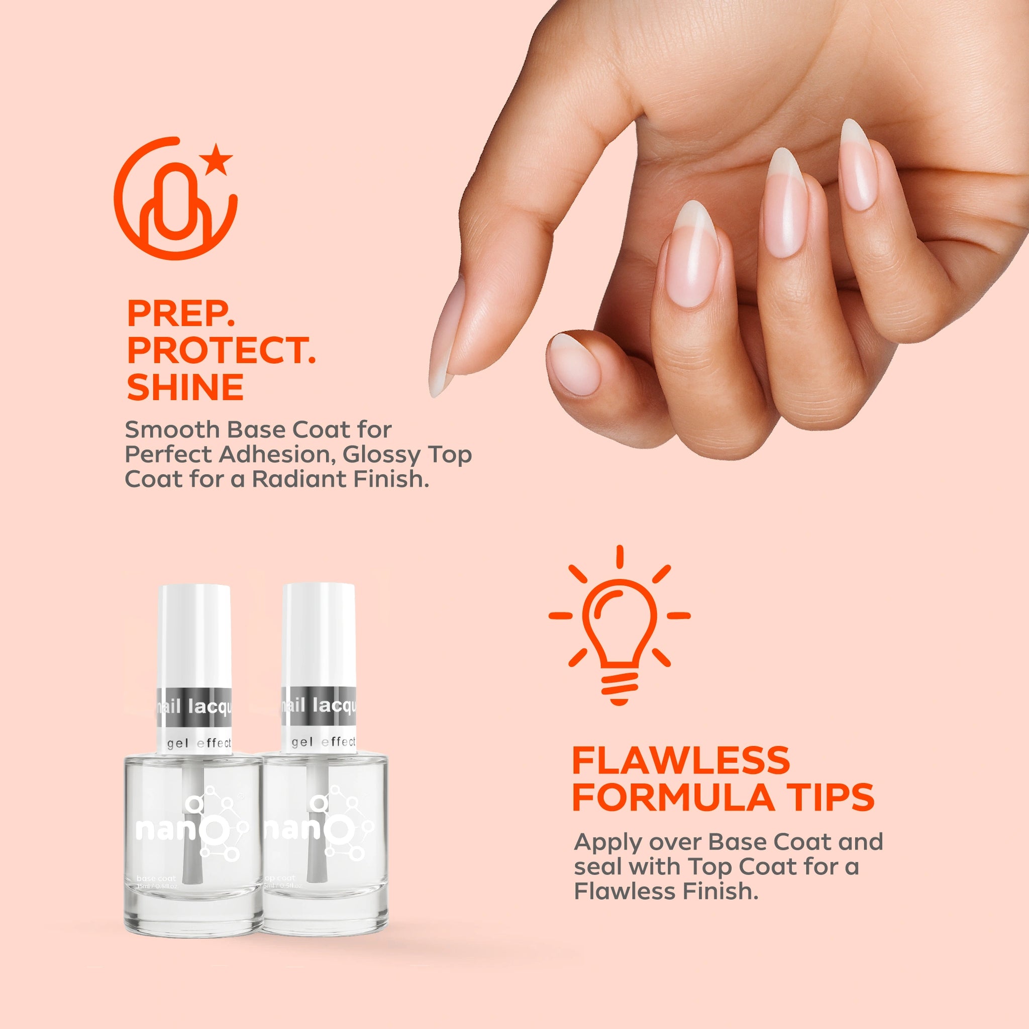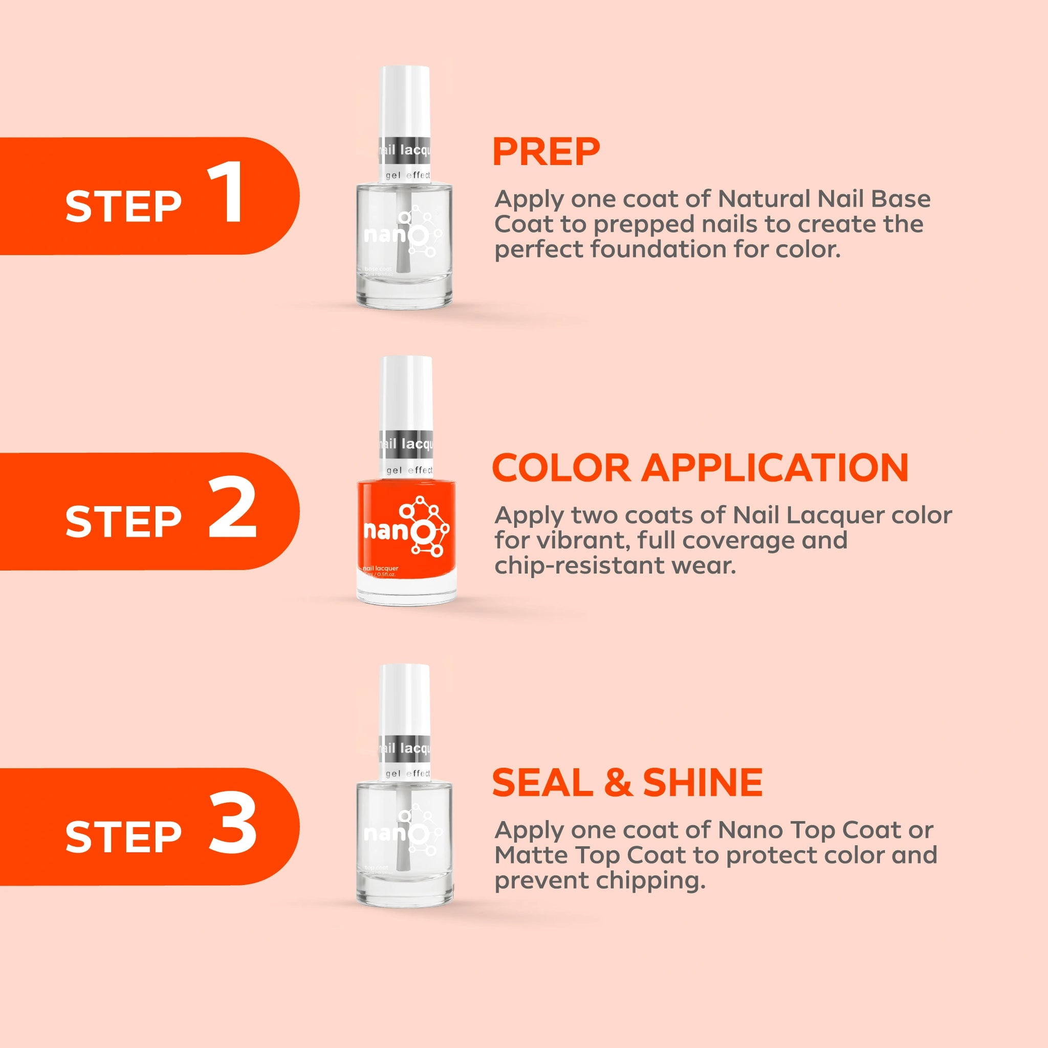 - ضعي طبقة من Nano® Normal Base Coat لحماية أظافرك الطبيعية وضمان التصاق أفضل.