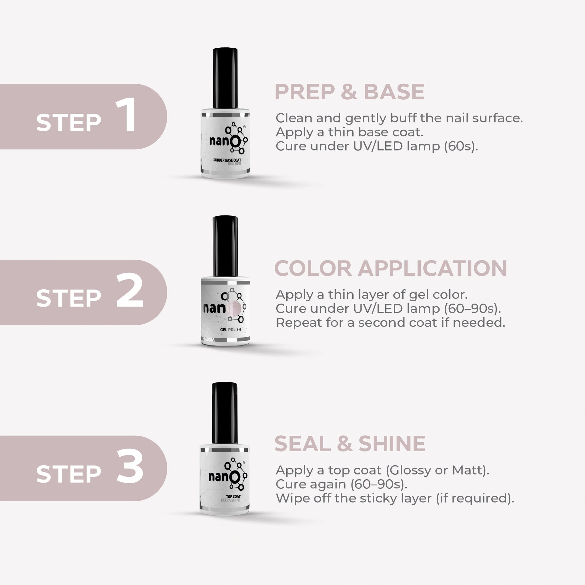 - ضعي طبقة ثانية من طلاء الأظافر الجل Nano® وجففيها تحت مصباح Nano UV/LED لمدة 60 ثانية إضافية.