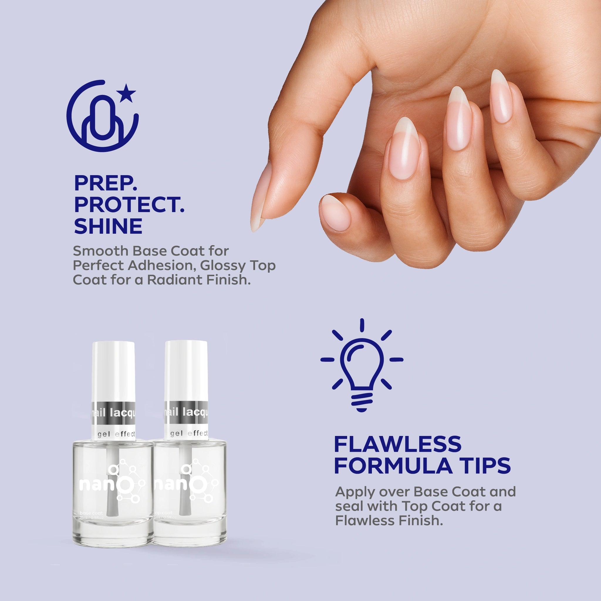- Apply a layer of Nano® Normal Base Coat to protect your natural nails and ensure better adhesion.