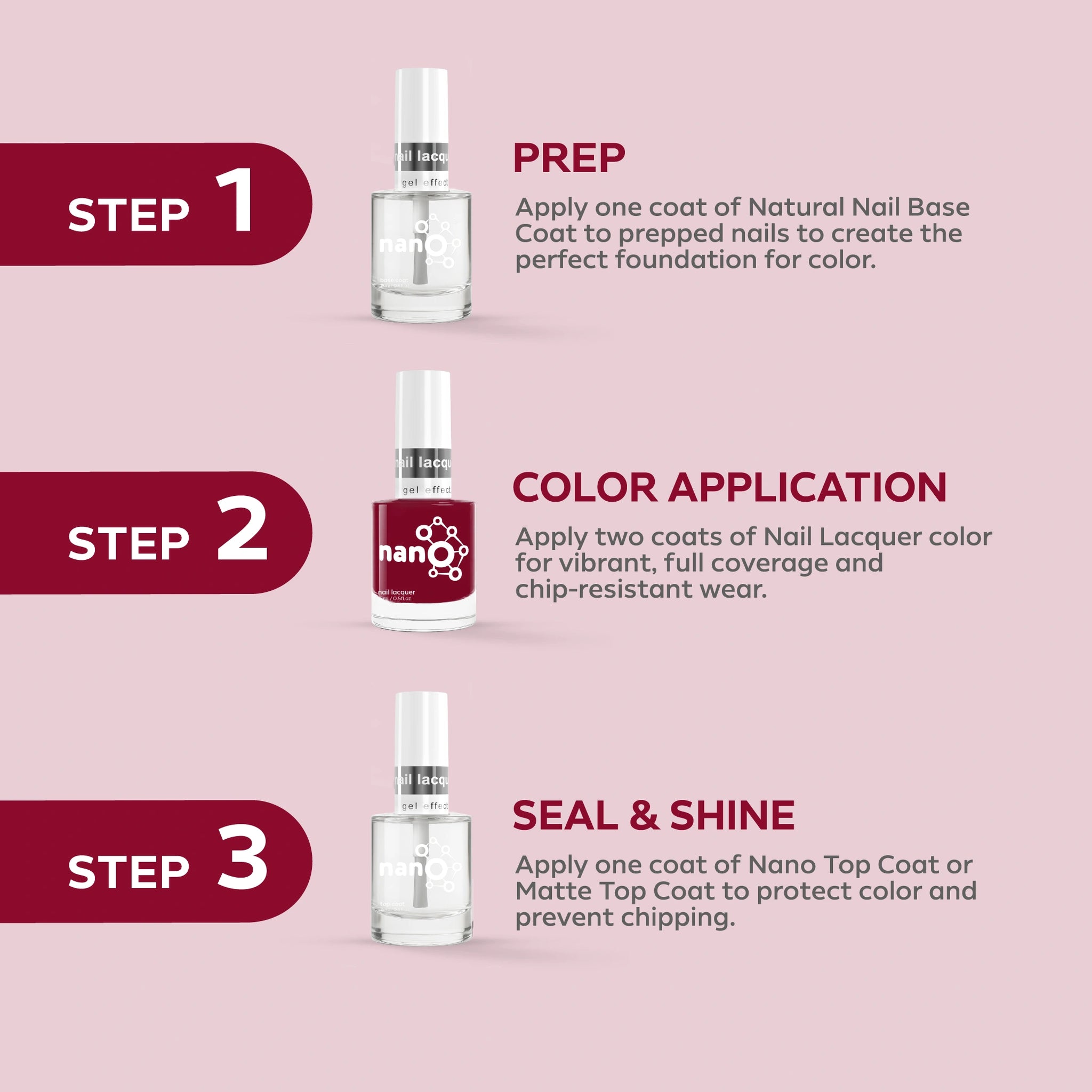 - Apply a layer of Nano® Normal Base Coat to protect your natural nails and ensure better adhesion.