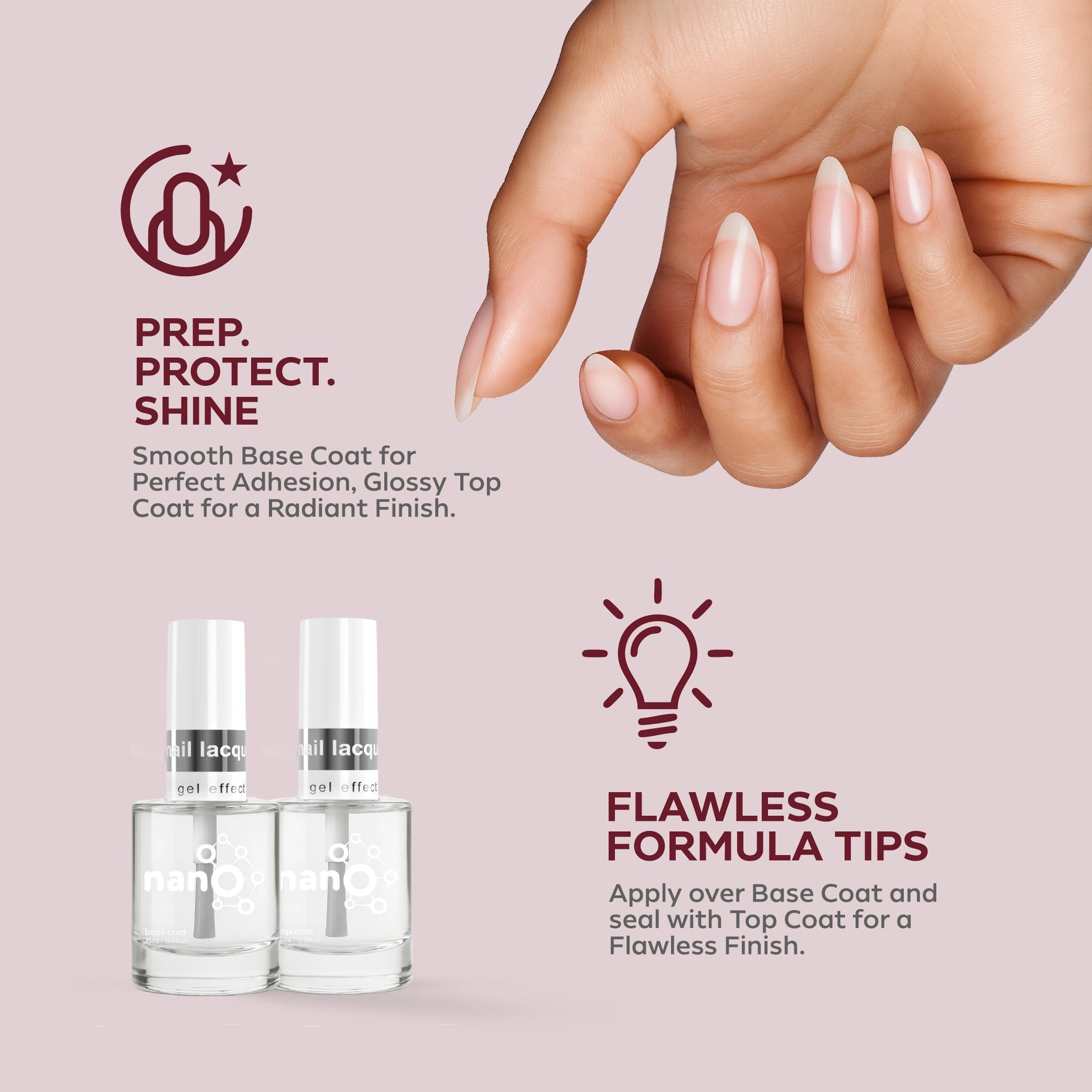 - Apply a layer of Nano® Normal Base Coat to protect your natural nails and ensure better adhesion.
