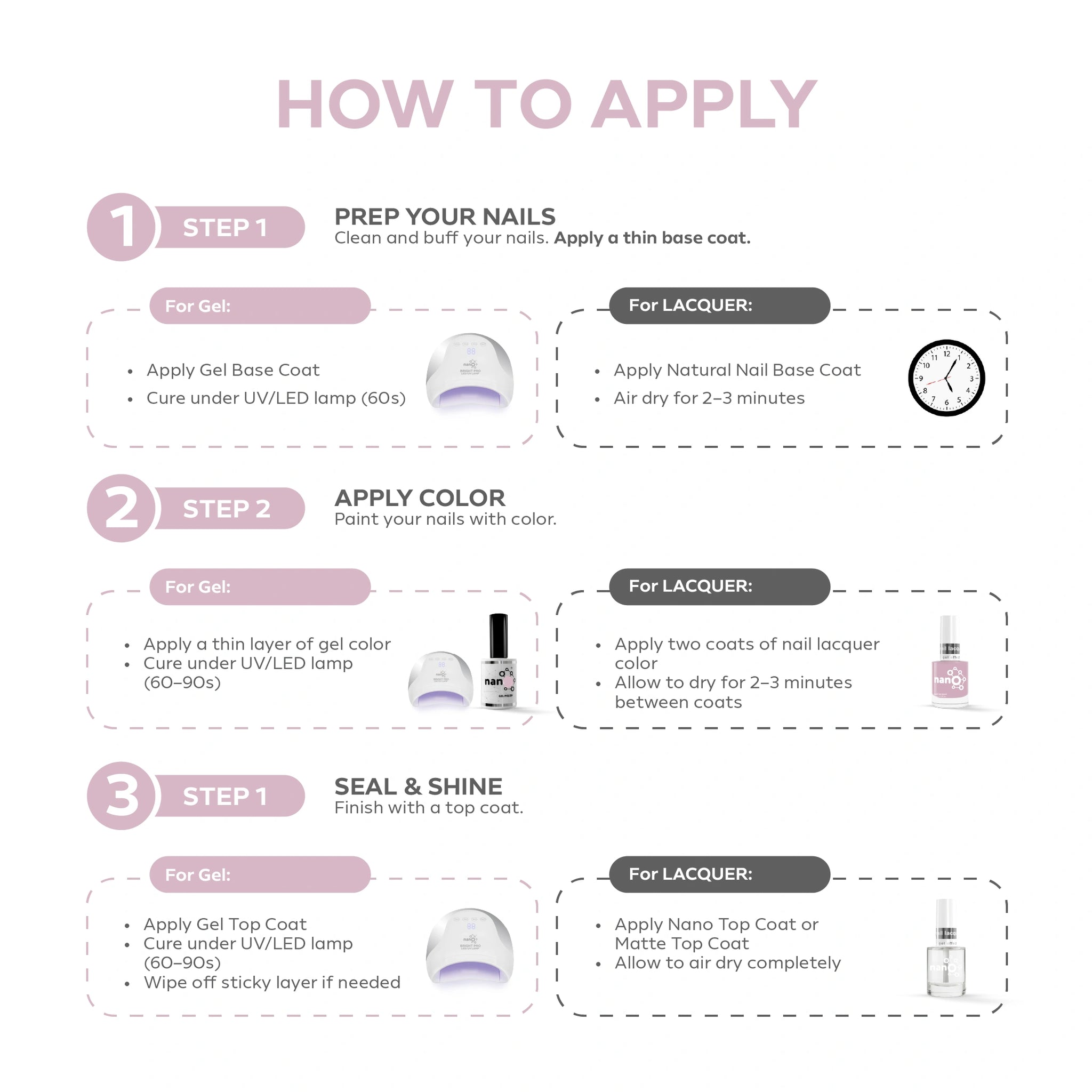- Apply Normal Base Coat to protect natural nails and improve adhesion.