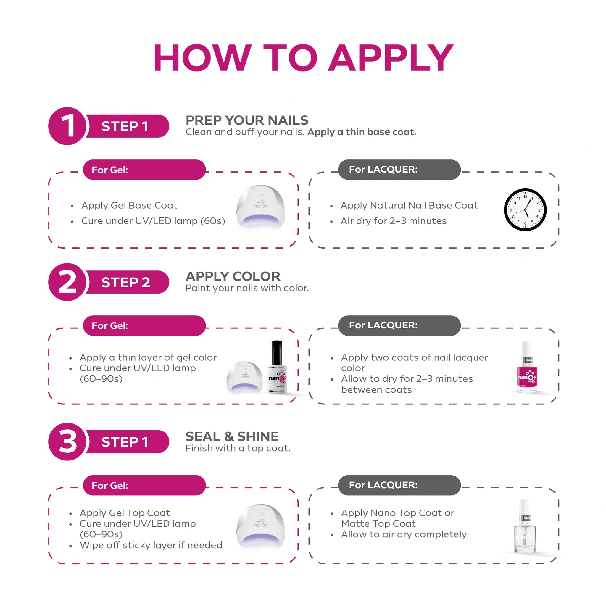 - Apply Normal Base Coat to protect natural nails and improve adhesion.