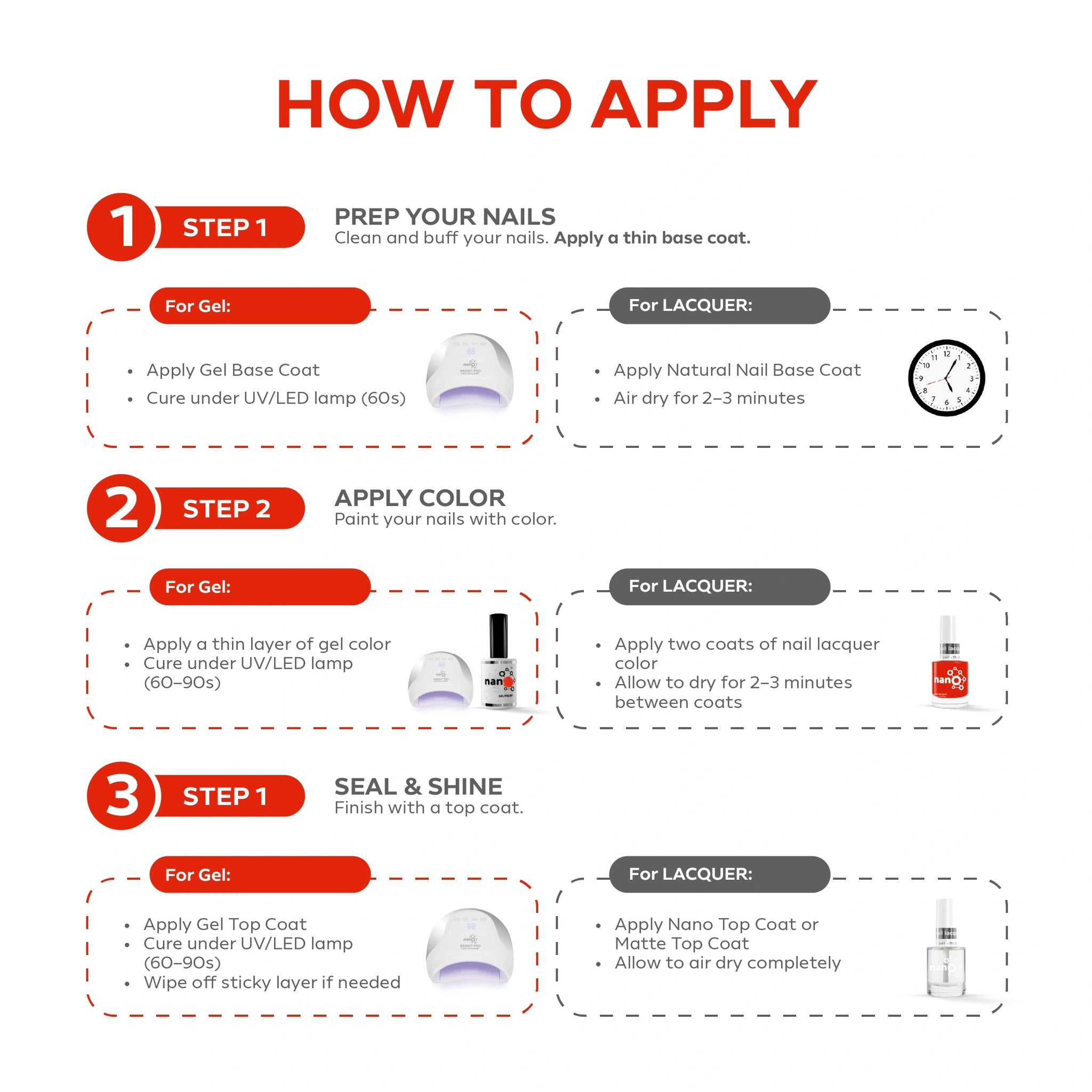 3. Apply the first coat of Nail Lacquer and allow it to air dry for 30 seconds.