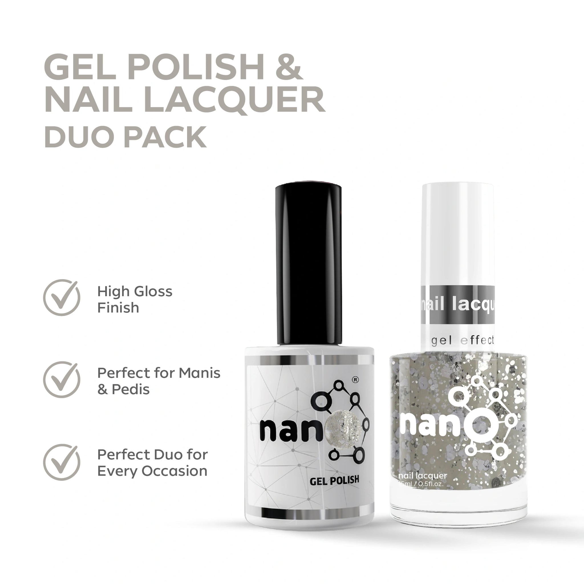 DuoPack combines a professional gel polish and a matching traditional nail polish for versatile nail services. The gel polish delivers long-lasting, high-gloss results when cured under a UV/LED lamp, while the classic nail polish provides smooth, air-dry color for everyday wear. Designed to offer both durability and flexibility in one coordinated set.