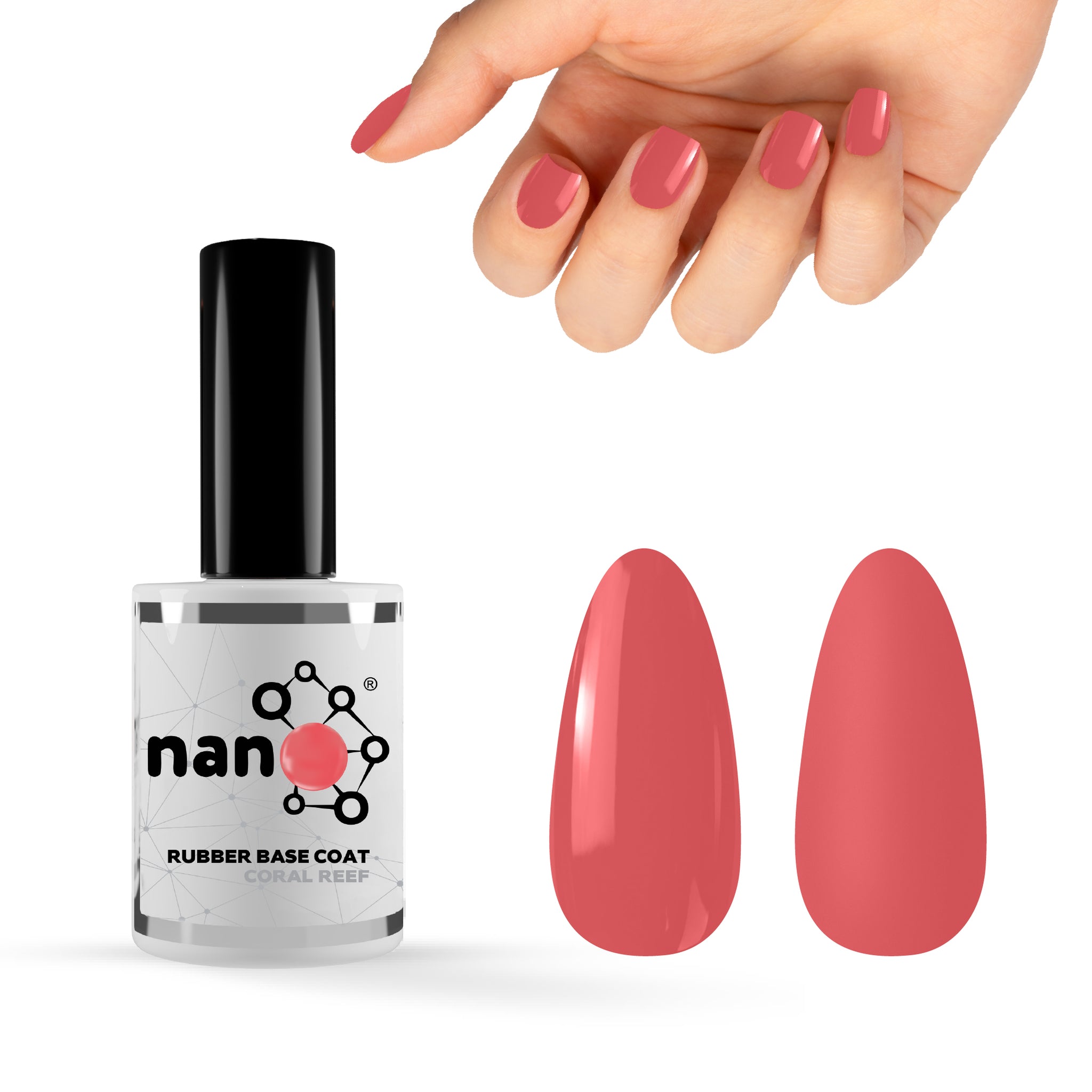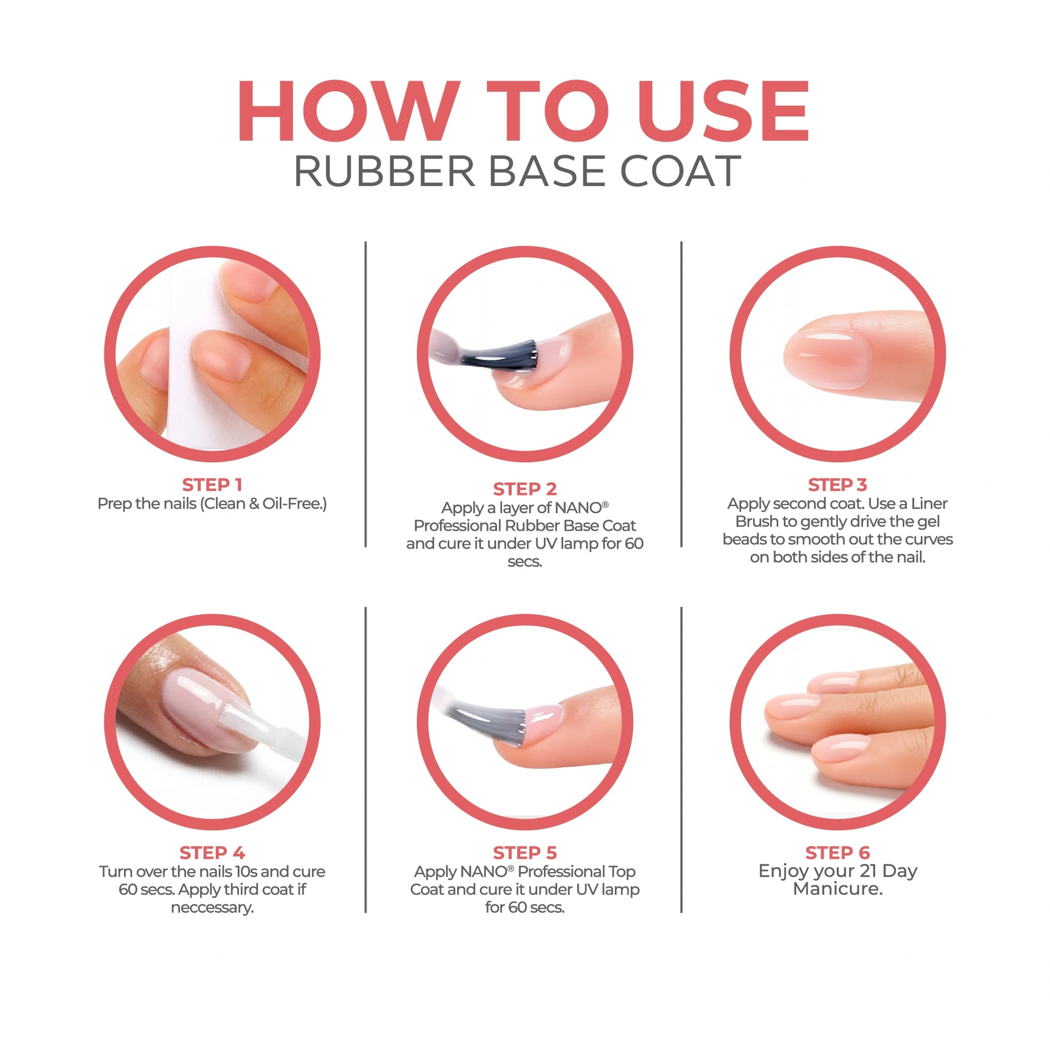 - ثم ضعي طبقة رقيقة من طلاء القاعدة المطاطي Nano® (بناء، متوسط أو خفيف حسب اختيارك) على الأظافر المحضرة.