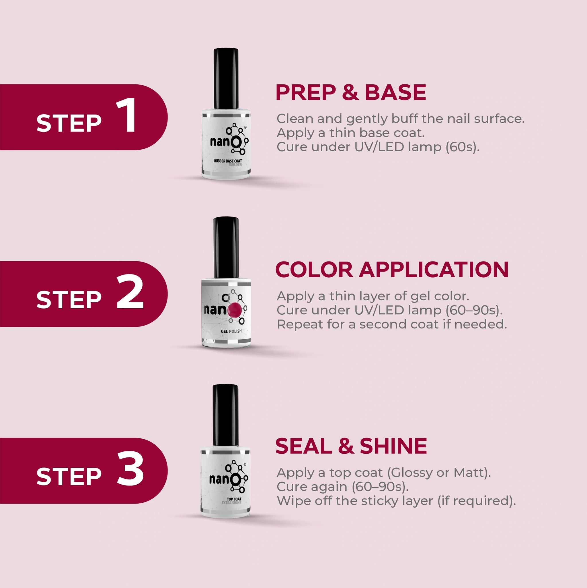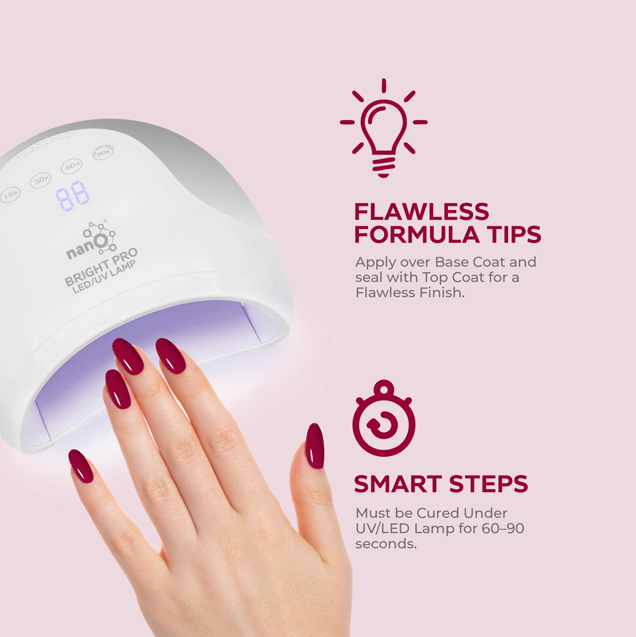- ضعي طبقة القاعدة Nano® / Light Builder المفضلة لديك على الأظافر النظيفة وجففيها تحت مصباح Nano® Bright UV/LED لمدة 60 ثانية.