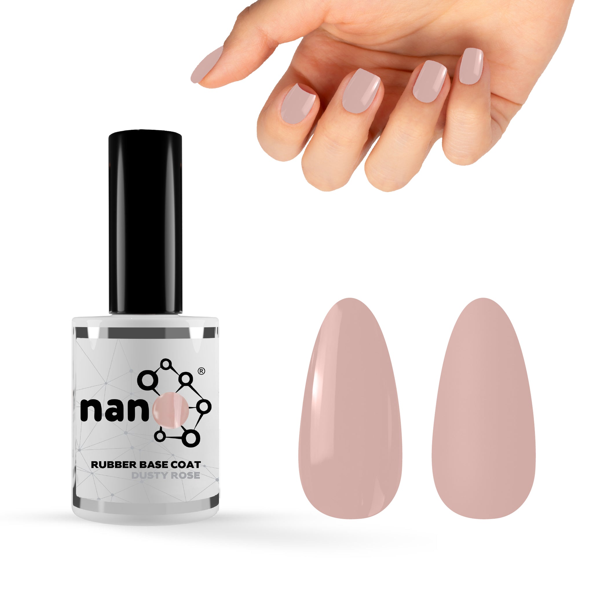 - ثم ضعي طبقة رقيقة من طلاء القاعدة المطاطي Nano® (بناء، متوسط أو خفيف حسب اختيارك) على الأظافر المحضرة.
