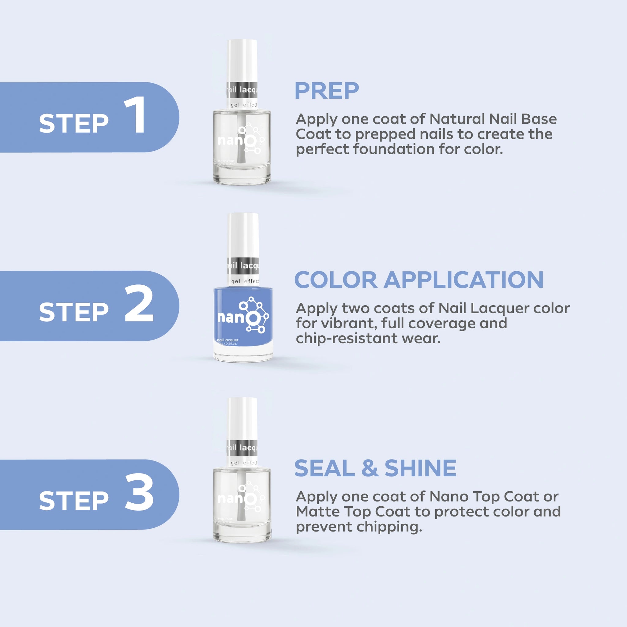- قم بإنهاء العمل عن طريق تطبيق Nano® Normal Top Coat للحصول على لمسة نهائية لامعة تدوم طويلاً.