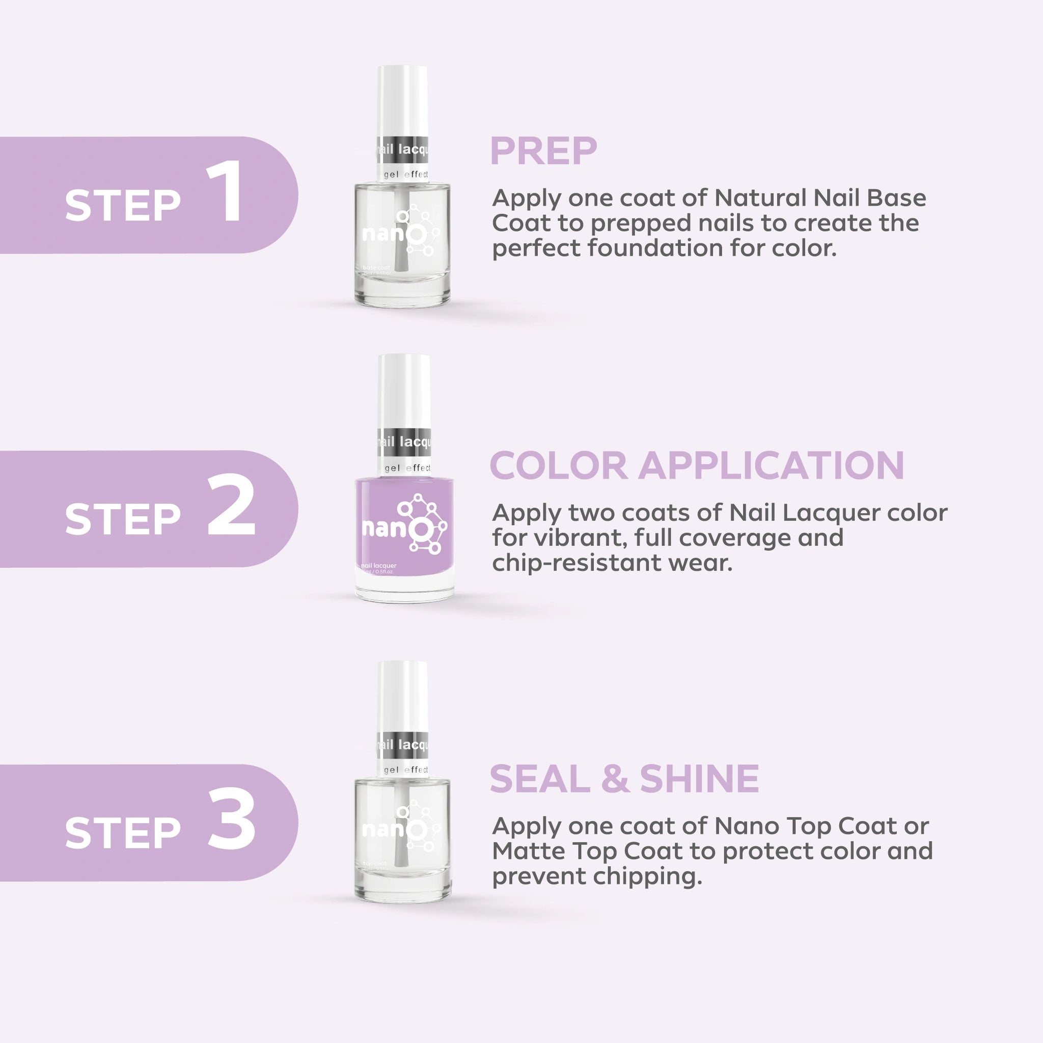 - ضعي طبقة من Nano® Normal Base Coat لحماية أظافرك الطبيعية وضمان التصاق أفضل.