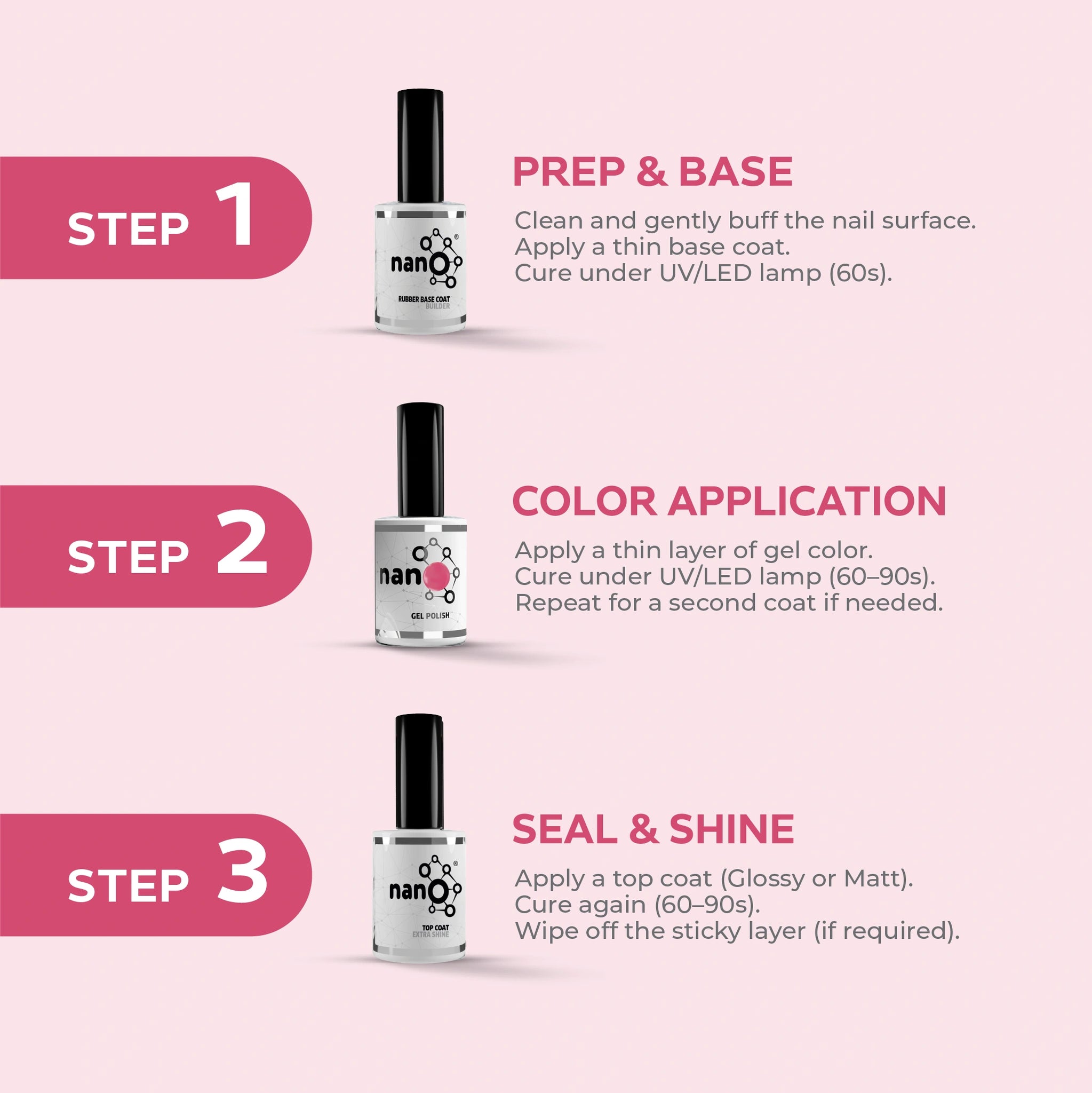 - ضعي طبقة ثانية من طلاء الأظافر الجل Nano® وجففيها تحت مصباح Nano UV/LED لمدة 60 ثانية إضافية.