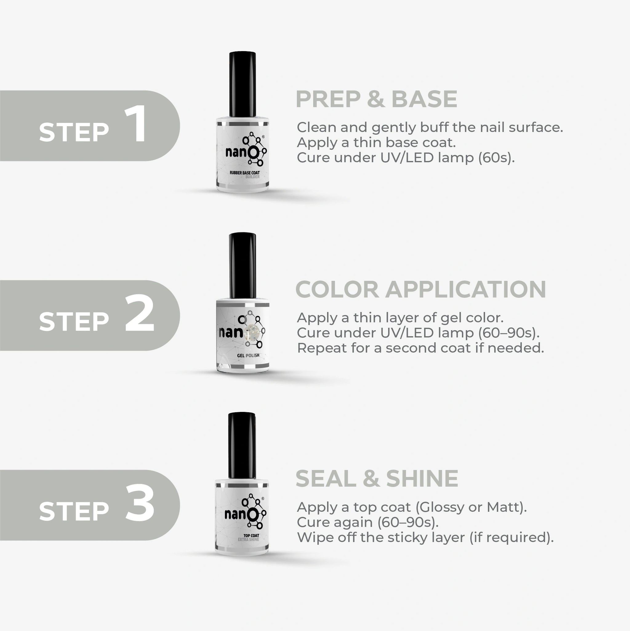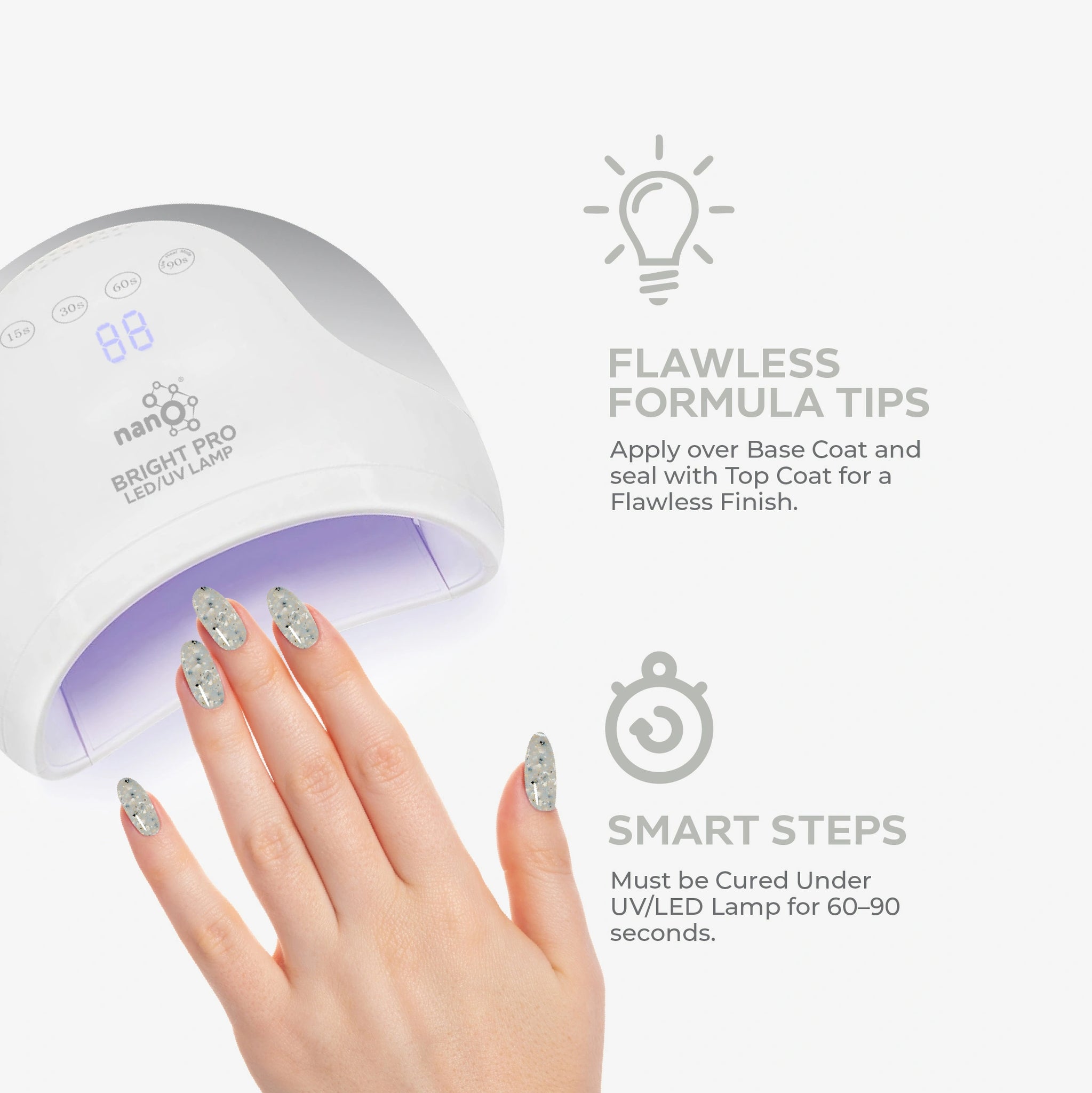 - ضعي طبقة القاعدة Nano® / Light Builder المفضلة لديك على الأظافر النظيفة وجففيها تحت مصباح Nano® Bright UV/LED لمدة 60 ثانية.