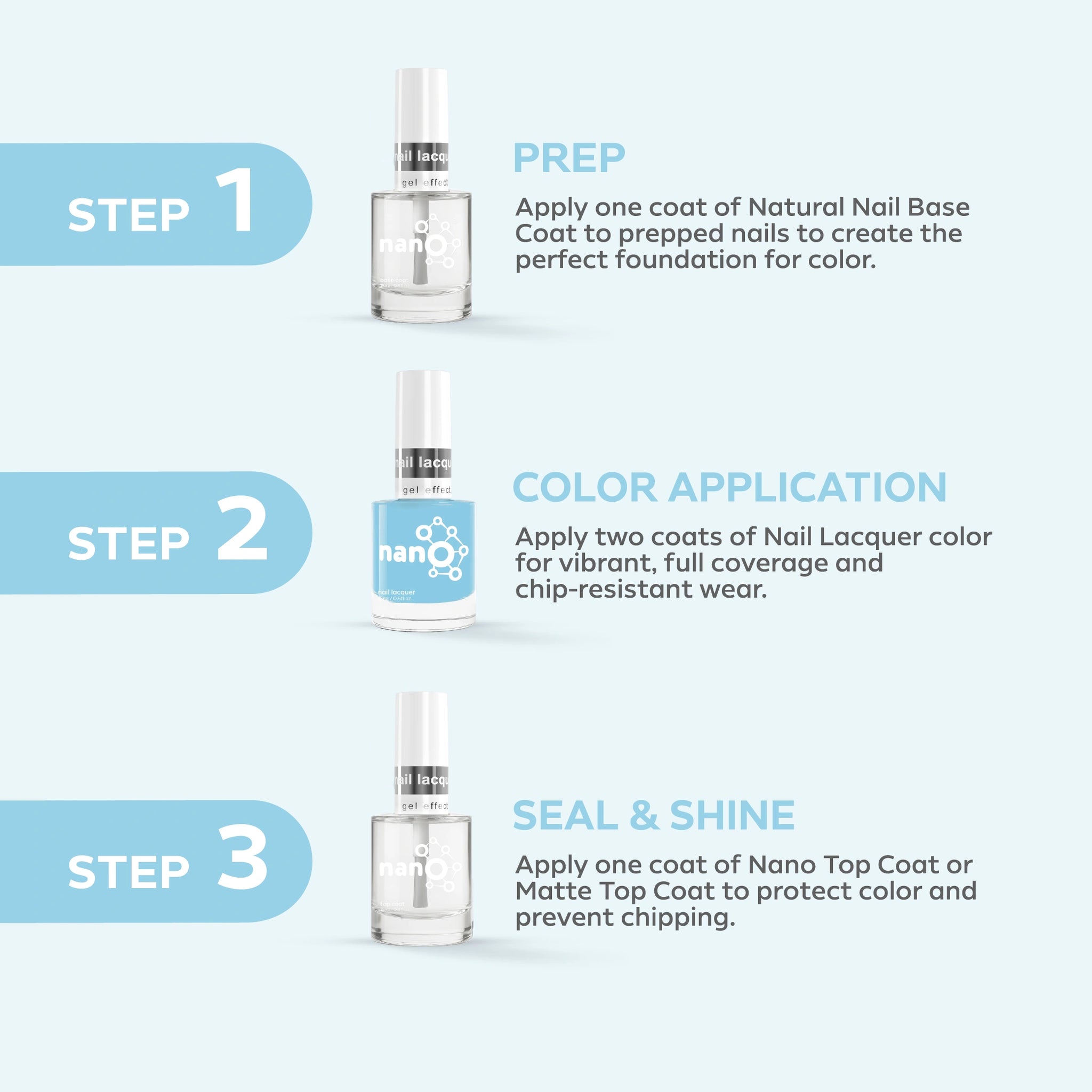 - ضعي طبقة القاعدة Nano® / Light Builder المفضلة لديك على الأظافر النظيفة وجففيها تحت مصباح Nano® Bright UV/LED لمدة 60 ثانية.