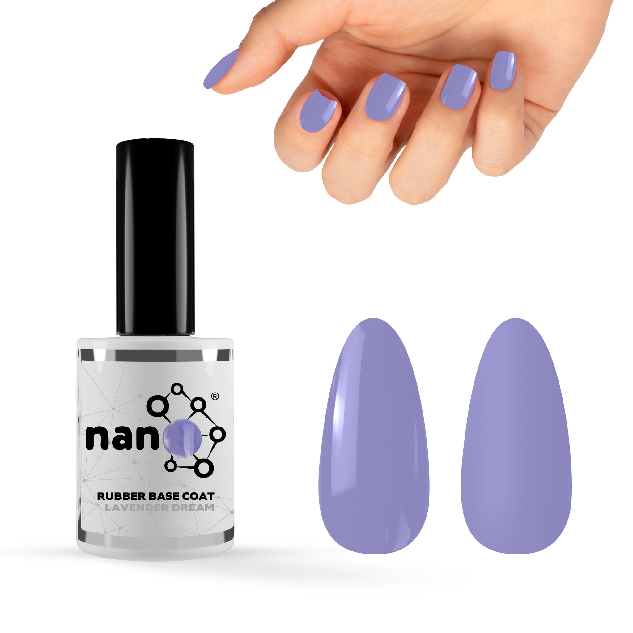 - ثم ضعي طبقة رقيقة من طلاء القاعدة المطاطي Nano® (بناء، متوسط أو خفيف حسب اختيارك) على الأظافر المحضرة.