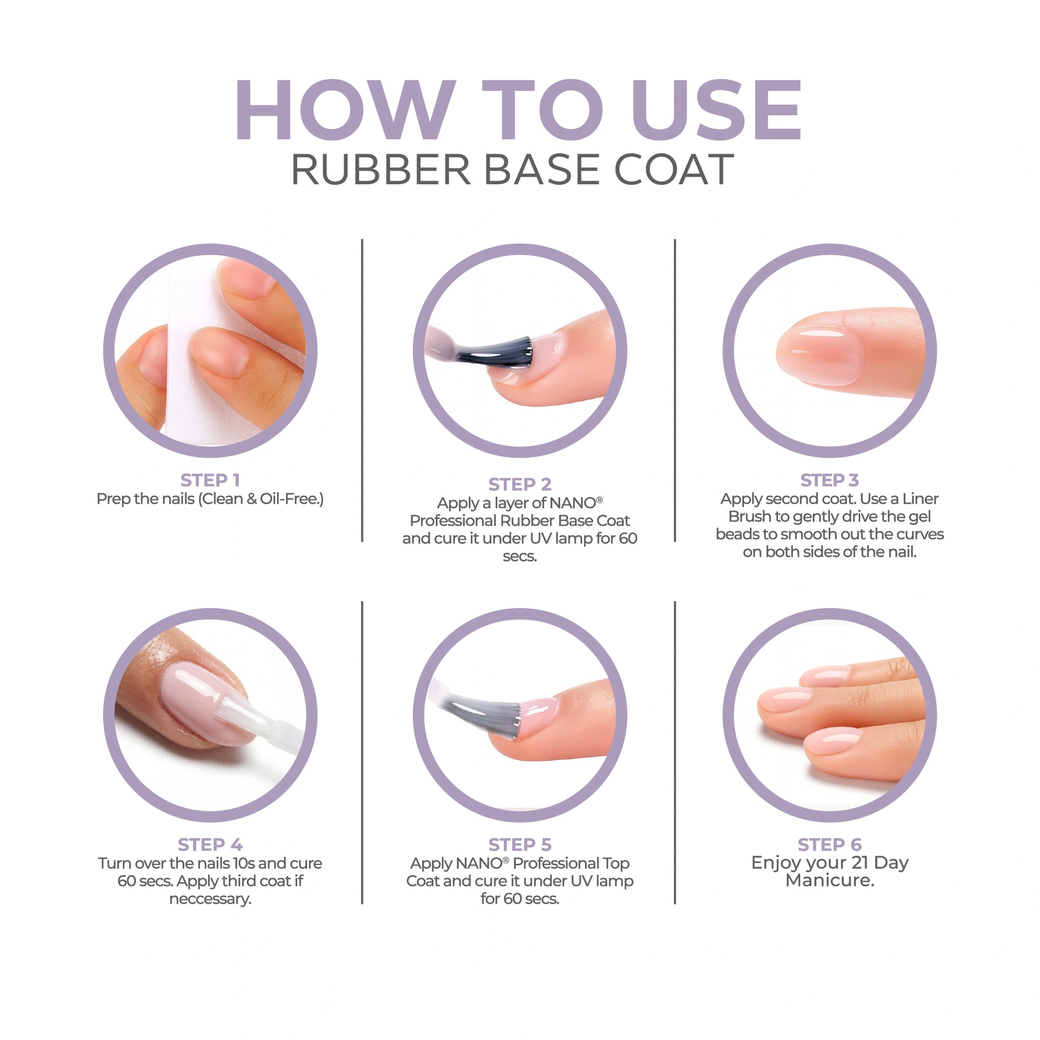 - ثم ضعي طبقة رقيقة من طلاء القاعدة المطاطي Nano® (بناء، متوسط أو خفيف حسب اختيارك) على الأظافر المحضرة.