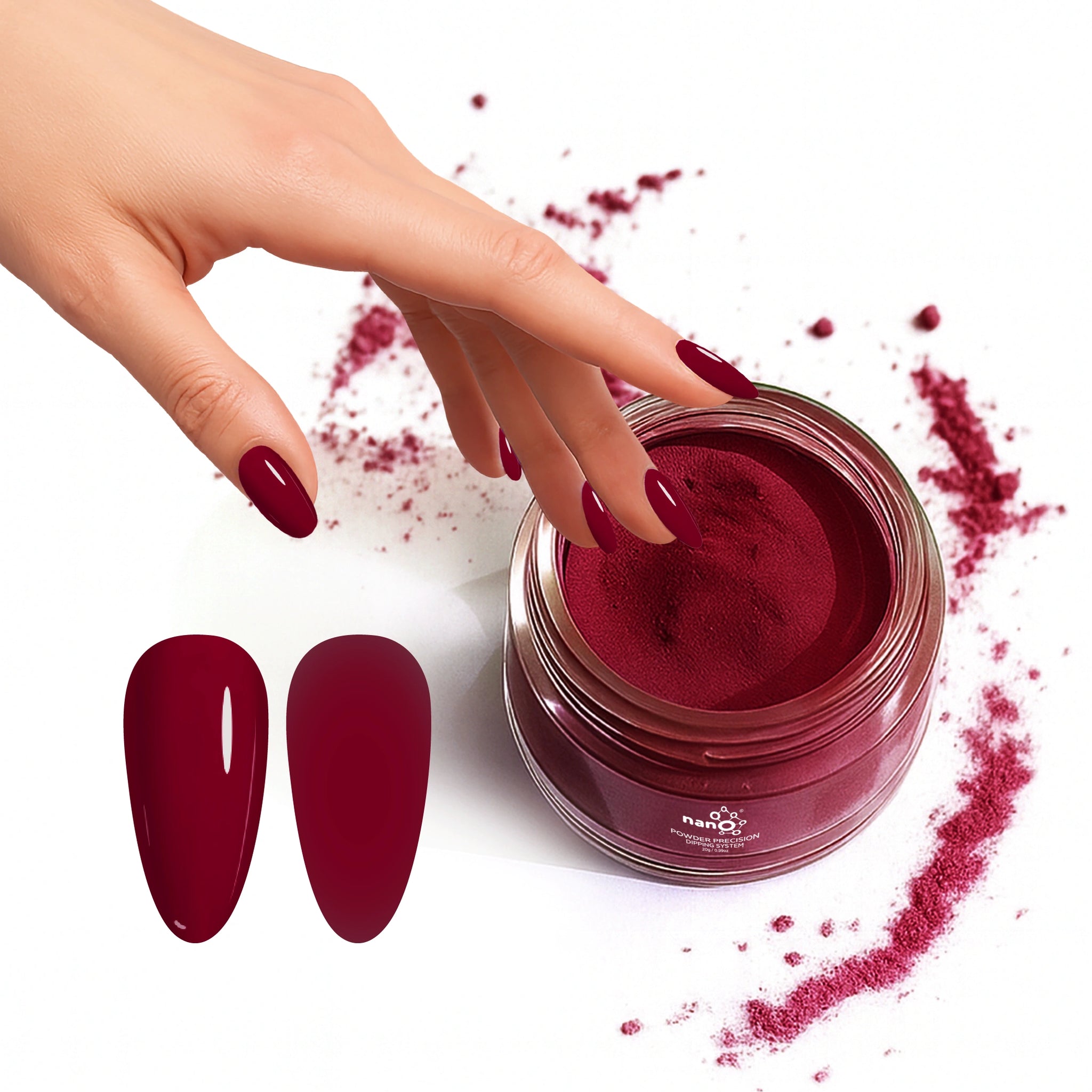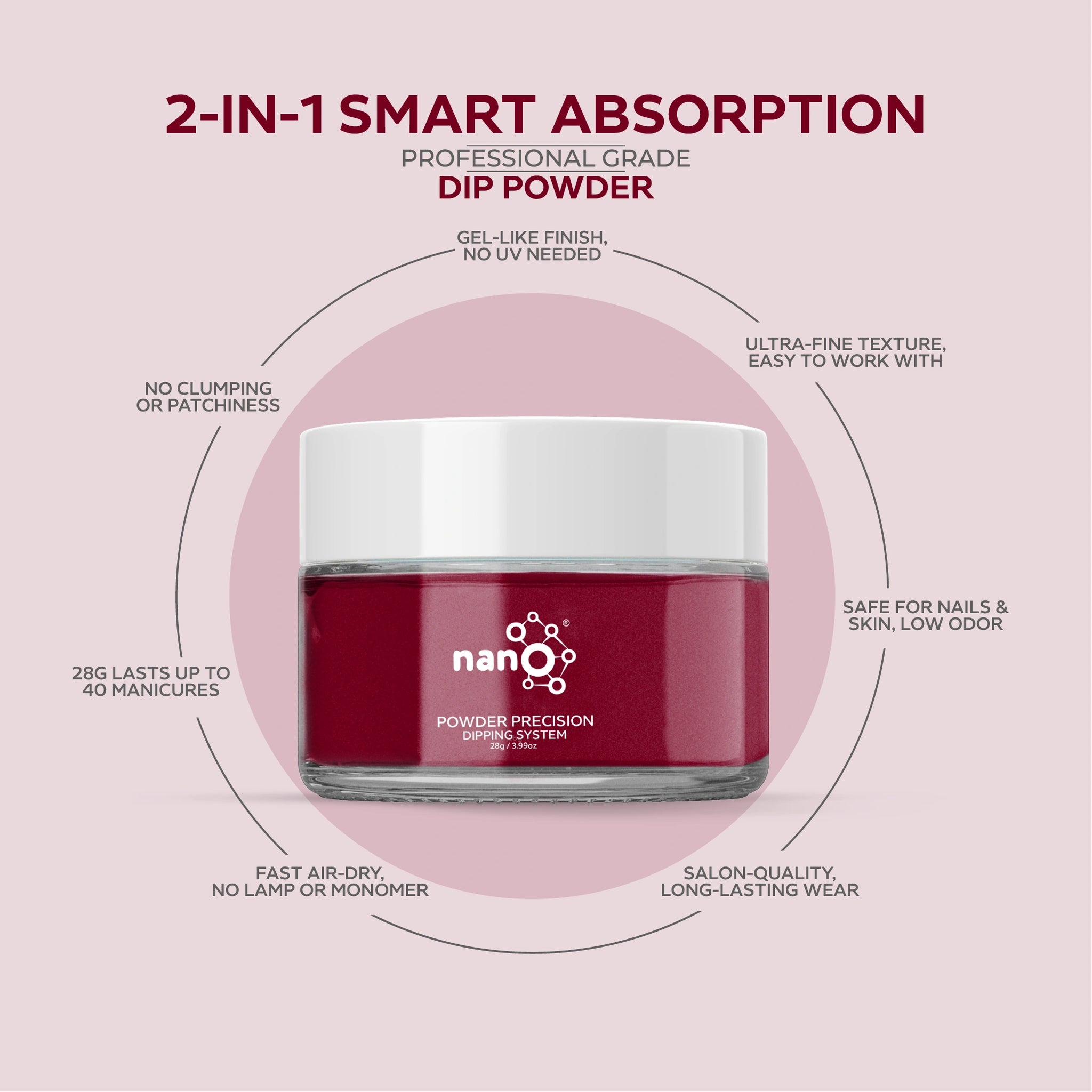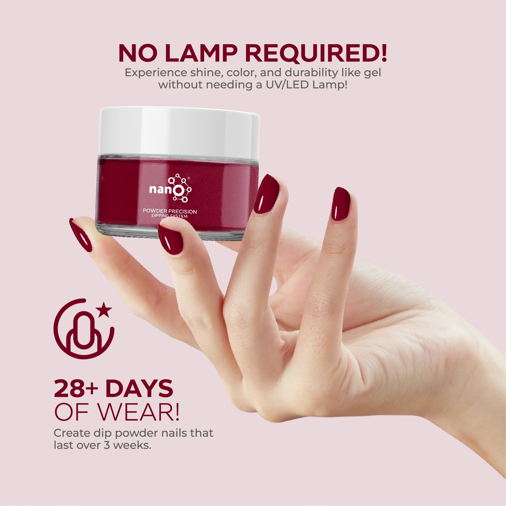 - أضيفي البودرة: اغمسي أظافرك فورًا في بودرة Nano® Dip Powder أو رشي البودرة بالتساوي على الأظافر. قومي بإزالة أي بودرة زائدة برفق.
