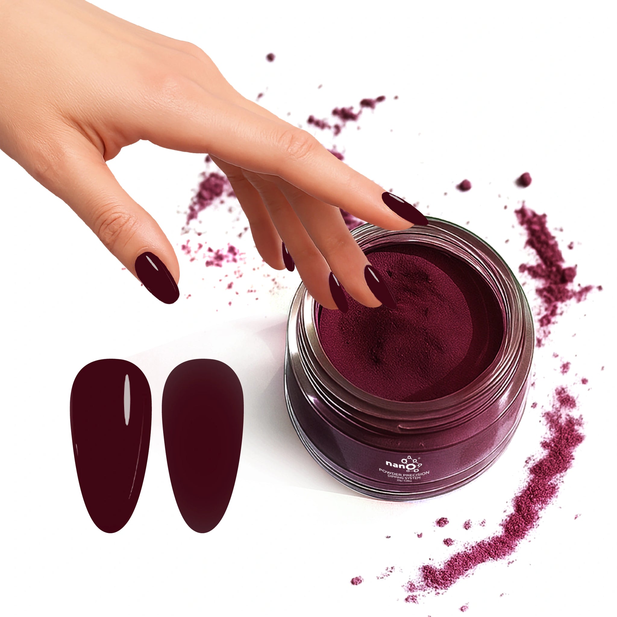 - أضيفي البودرة: اغمسي أظافرك فورًا في بودرة Nano® Dip Powder أو رشي البودرة بالتساوي على الأظافر. قومي بإزالة أي بودرة زائدة برفق.