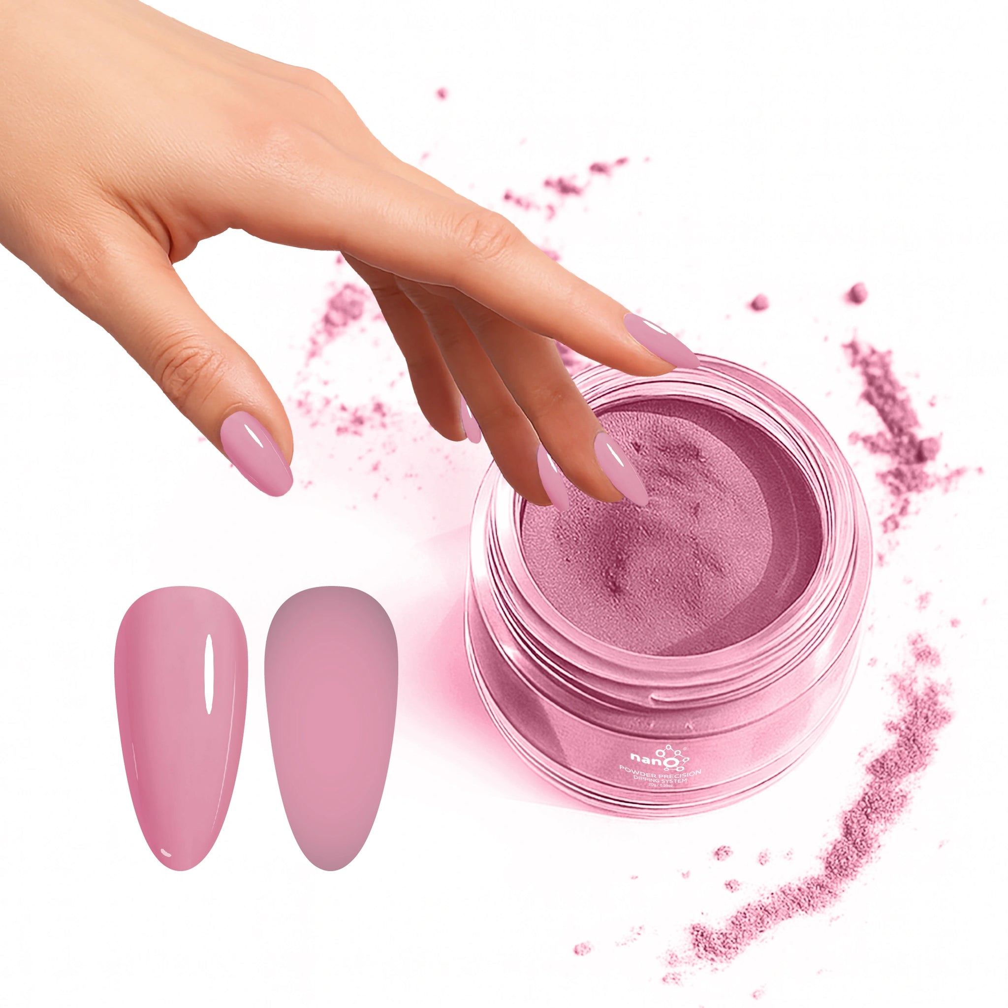 - أضيفي البودرة: اغمسي أظافرك فورًا في بودرة Nano® Dip Powder أو رشي البودرة بالتساوي على الأظافر. قومي بإزالة أي بودرة زائدة برفق.