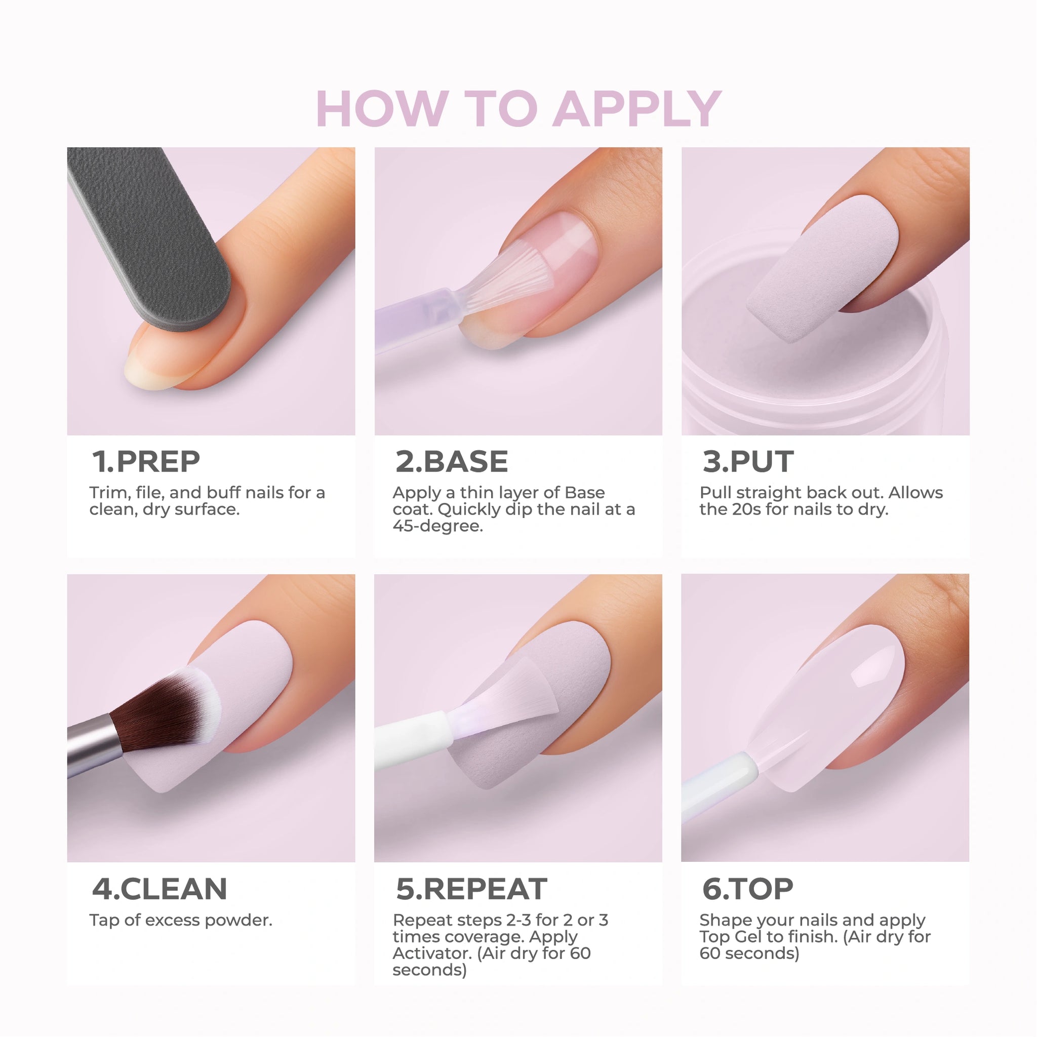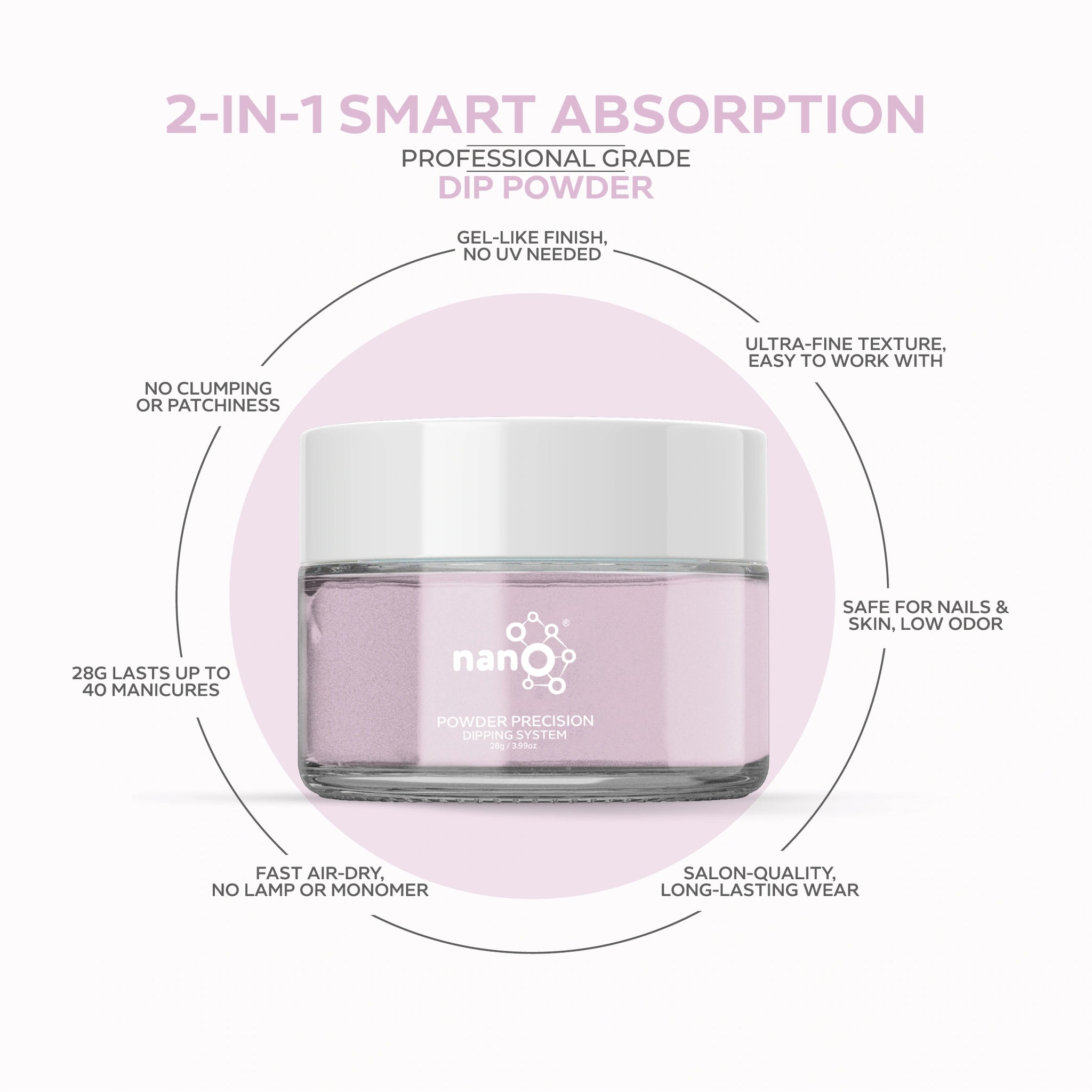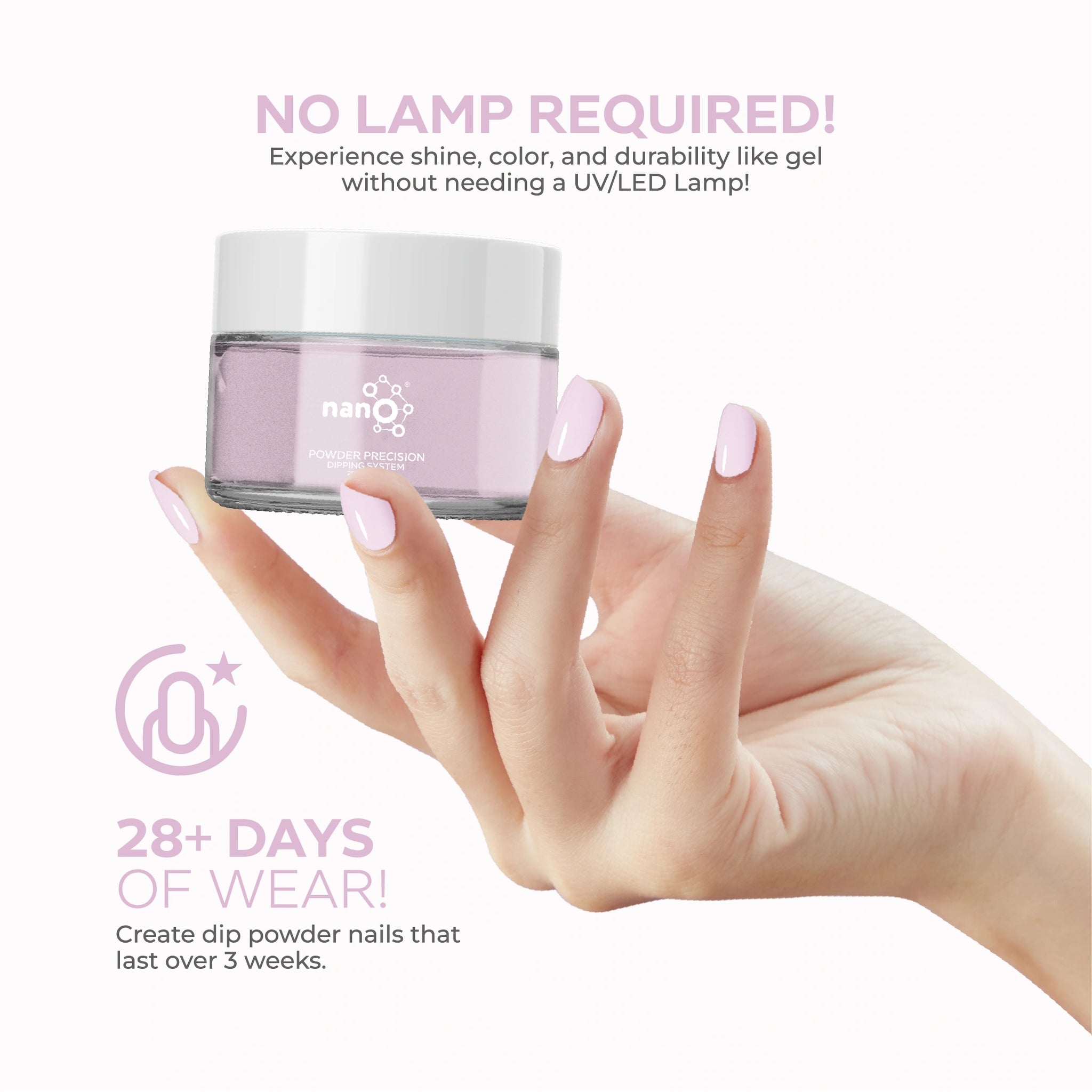 - أضيفي البودرة: اغمسي أظافرك فورًا في بودرة Nano® Dip Powder أو رشي البودرة بالتساوي على الأظافر. قومي بإزالة أي بودرة زائدة برفق.
