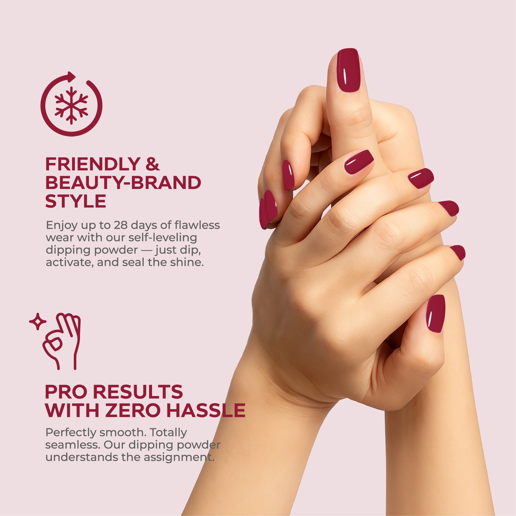 • احصلي على لمسة نهائية بجودة الصالون باستخدام نظام مسحوق الغمس البسيط وسهل الاستخدام.